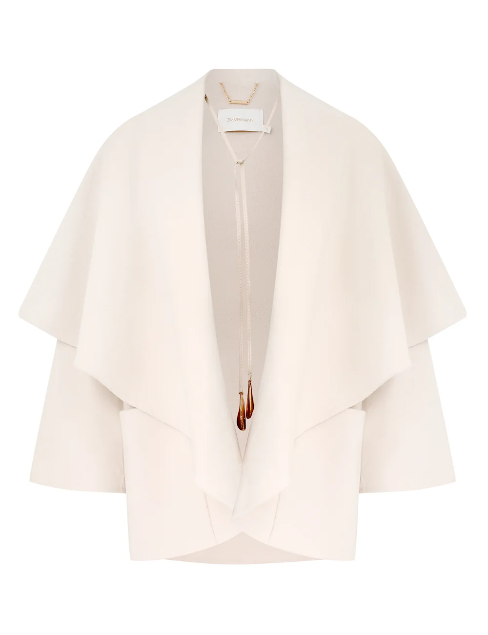 ITEM DETAILS The Rebellion Tie Neck Cape in Cream from our Cruise 2026 Collection, Twisted Romance. A wool blend coat featuring an asymmetrical hem and cape style draping. - Wool blend fabric - Cape style coat - Rouleau necktie - Patch pockets at front - Worn open Style Code: 6838CC261 SIZE DETAILS XS S M L Length 28 30 30.5 30.5 Bust 37 39.5 43.5 47 Waist 41 43.5 47 51 Sleeve 20 21.5 22 22.5 Oversized style Heavy-weight fabric This garment fits true to size Available in size 0P, suited to clients who are under 5'3"/ 160cm Model is 5'9.5"/178 cm, bust size 32C/10C and wears a size 0 Item measurements are in inches CARE INSTRUCTIONS Main: 58% wool, 16% polyamide, 14% viscose, 12% silk Dry clean only code f (hydrocarbon only); Remove any detachable trims prior to dry cleaning; Cover to protect trim; Iron in low temperature with protective cloth; Light steam only; Do not spot clean Always check the label or care card for specific care instructions.