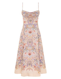 ITEM DETAILS The Rebellion Tuck Midi Dress in Blue Floral from our Cruise 2026 Collection, Twisted Romance. A linen midi dress featuring drape detailing across the bust, adjustable straps, finished with a full flare skirt. - Linen fabric - Ruching at bust - Bust with internal boning - Shirred elastic across centre back - Invisible centre back zip closure - Lined Style Code: 6939DC261 SIZE DETAILS 0P 0 1 2 3 4 Length 33.5 36.5 36.5 36.5 36.5 36.5 Bust 32.5 34.5 36 38.5 40 42.5 Waist 24.5 26 27.5 30 31.5 34 Designed to be fitted at the bust and waist, loose at the hip Mid-weight, non-stretchy fabric This garment fits true to size Available in size 0P, suited to clients who are under 5'3"/ 160cm Model is 5'9.5"/178 cm, bust size 32C/10C and wears a size 0 Item measurements are in inches CARE INSTRUCTIONS Red main: 100% linen; fusing: 100% polyester; belt: 100% silk buf main: 100% linen; fusing: 100% polyester Dry clean only code f (hydrocarbon only); Remove any detachable trims prior to dry cleaning; Cover to protect trim; Iron in low temperature with protective cloth; Light steam only; Do not spot clean Always check the label or care card for specific care instructions.