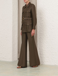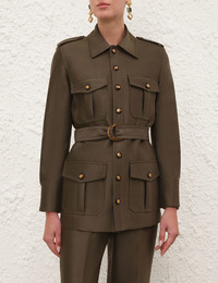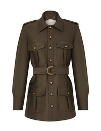 ITEM DETAILS The Rebellion Utility Jacket in Dark Olive from our Cruise 2026 Collection, Twisted Romance. A wool-silk blend jacket featuring a classic collar, gold buttons down the centre front and functional flap pockets. - Wool-silk blend fabric - Gold button detailing - Front pockets at chest and hips - Shoulder lapels - Self covered removable hardware belt - Buttoned cuffs - Fully lined Style Code: 7003JC261 SIZE DETAILS 0P 0 1 2 3 4 Length 27 31 29 29.5 30 30 Bust 36 38.5 40 42.5 44 46.5 Waist 37 38.5 41 42.5 45 46.5 Sleeve 22.5 24 24.5 24.5 25 25 Tailored fit Heavy-weight, non-stretchy fabric This garment fits true to size Available in size 0P, suited to clients who are under 5'3"/ 160cm Model is 5'9.5"/178 cm, bust size 32C/10C and wears a size 0 Item measurements are in inches CARE INSTRUCTIONS Main: 92% wool, 8% silk; lining: 75% viscose, 25% silk Dry clean only code f (hydrocarbon only); Remove any detachable trims prior to dry cleaning; Cover to protect trim; Iron in low temperature with protective cloth; Light steam only; Do not spot clean Always check the label or care card for specific care instructions.