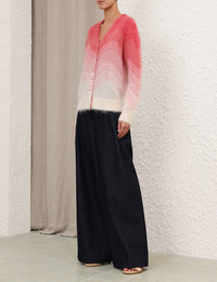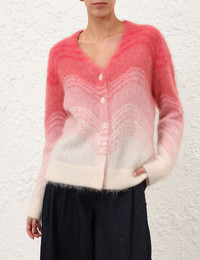 ITEM DETAILS The Rebellion Wave Cardigan in Pink Multi from our Cruise 2026 Collection, Twisted Romance. A mohair wool cardigan featuring a deep V-neckline, buttons down the centre front and a ribbed trim. - Wool blend cardigan - Oversized fit - Ribbed cuffs and hem - Functional wooden buttons down the centre front Style Code: 6673TC261 SIZE DETAILS 0P 0 1 2 3 4 Length 22 23.5 24 24.5 24.5 25 Sleeve 21 22.5 23 23 23 23.5 Designed for an oversized, loose fit This garment fits true to size Available in size 0P, suited to clients who are under 5'3"/ 160cm Model is 5'9.5"/178 cm, bust size 32C/10C and wears a size 0 Item measurements are in inches CARE INSTRUCTIONS 55% mohair wool 30% nylon 15% woo Dry clean only code f (hydrocarbon only) Remove any detachable trims prior to dry cleaning Cover to protect trim Iron in low temperature with protective cloth Do not spot clean Store garment flat do not hang Always check the label or care card for specific care instructions.