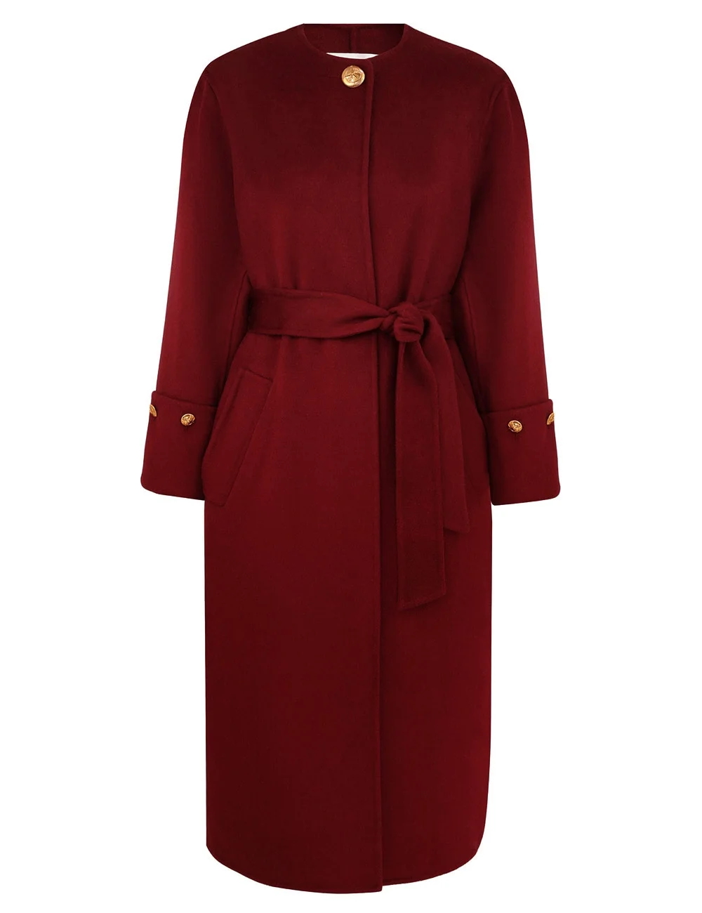 ITEM DETAILS The Rebellion Wrap Coat in Burgundy from our Cruise 2026 Collection, Twisted Romance. A wool blend coat featuring a crew neckline, gold button detailing, front flap pockets and a self-tie waist belt. - Wool blend fabric - Midi-length coat - Gold button closure at neckline - Removable soft waist belt - Folded cuffs with gold button detailing - Front welt pockets - Unlined Style Code: 6852CC261 SIZE DETAILS 0P 0 1 2 3 4 Length 42.5 47.5 48 48.5 48.5 49 Bust 42.5 44 46.5 48 50.5 53 Hip 42.5 45 46.5 49 50.5 53 Sleeve 21.5 23 23 23 23.5 23.5 Designed for a relaxed fit This garment fits true to size Available in size 0P, suited to clients who are under 5'3"/ 160cm Model is 5'9.5"/178 cm, bust size 32C/10C and wears a size 0 Item measurements are in inches CARE INSTRUCTIONS Main: 58% wool, 16% polyamide, 14% viscose, 12% silk Dry clean only code f (hydrocarbon only); Remove any detachable trims prior to dry cleaning; Cover to protect trim; Iron in low temperature with protective cloth; Light steam only; Do not spot clean Always check the label or care card for specific care instructions.
