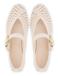 ITEM DETAILS The Reef Ballerina in Powder from our Spring 2025 Collection, Illumination. A Mary Jane ballerina shoe featuring a branded ZIMMERMANN buckle and raffia cornely throughout. - Mary Jane ballerina design - Made in Italy - Round toe - Branded gold buckle Style Code: 3296FS25A1 SIZE DETAILS This shoe fits true to size. CARE INSTRUCTIONS Lining: 100% leather, sock-soletto: 100% leather, main: 60% viscose, 40% cotton, outsole-suola: 95% leather, 5% thermo-plastic-rubber Textile care:; To maintain optimal condition, apply a pfas-free waterproofing spray to the entire item and spot-clean stains with mild detergent. ; Rinse thoroughly to remove any soap residue, and air dry away from direct sunlight. ; If needed, gently brush with a soft brush. ; Please note, the material may lose some stiffness over time. ; For printed materials, pigments may transfer through fibers, so handle with care. ; Avoid contact with pigmented materials to prevent staining. Store in a dry, moisture-free environment in its dust bag. Always check the label or care card for specific care instructions.