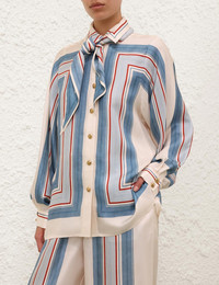 ITEM DETAILS The Relaxed Scarf Shirt in Ticking Stripe from our Cruise 2026 Collection, Twisted Romance. A silk shirt featuring a classic collar, long sleeves and buttons down the centre front. - 100% silk fabric - Relaxed fit shirt - Long sleeves with buttoned cuffs - Side splits at hip panels - Removable silk tie - Functional buttons down centre front Style Code: 6357TC26R SIZE DETAILS 0P 0 1 2 3 4 Length 26 27.5 28 28 28.5 28.5 Bust 48 50.5 53 54.5 56.5 58.5 Waist 48 50.5 53 54.5 56.5 58.5 Sleeve 20.5 22 22.5 23 23 23 Designed for a relaxed fit This garment fits true to size Available in size 0P, suited to clients who are under 5'3"/ 160cm Model is 5'9.5"/178 cm, bust size 32C/10C and wears a size 0 Item measurements are in inches CARE INSTRUCTIONS Main and tie: 100% silk Dry clean only code f (hydrocarbon only); Remove any detachable trims prior to dry cleaning; Cover to protect trim; Iron in low temperature with protective cloth; Light steam only; Do not spot clean Always check the label or care card for specific care instructions.