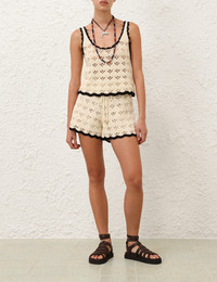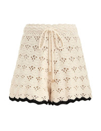 ITEM DETAILS The Rhiannon Crochet Short in Cream/Black from our Summer Swim 2025 Collection. A knit short featuring scalloped edging, a drawstring waist and contrast trims along the hem. - Knit fabric with crochet pattern - Self tie waist with toggles - Mid rise waistband with scallop detailing - Contrasting colour on hem Campaign: This style was featured in the Summer Swim 2025 Campaign. Style Code: 3565ASS251 SIZE DETAILS 0P 0 1 2 3 Length 13 14 14 14.5 14.5 Waist 24.5 26 28.5 30 32.5 Hip 38 39.5 41.5 44 45.5 Inseam 3 3 3 3 3 Designed with an elasticated waistband for a flexible fit This garment fits true to size Available in size 0P, suited to clients who are under 5'3"/ 160cm Model is 5'9.5"/178 cm, bust size 32C/10C and wears a size 0 Item measurements are in inches CARE INSTRUCTIONS Main : 100% cotton trim : 100% viscose lining : 100% cotton Dry clean only code f (hydrocarbon only); Remove any detachable trims prior to dry cleaning; Cover to protect trim; Cool iron with protective cloth; Do not spot clean; Store garment flat do not hang Always check the label or care card for specific care instructions.