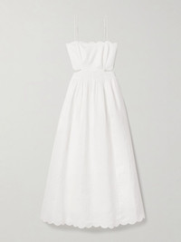 Zimmermann's dress has delicate scalloped trims and intricate pleats that give it a subtle romantic feel. Made from white linen-voile, it rests on thin straps and has cutouts along the waist that extend along the back. Size & Fit - 00 (petite) = UK 6/ US 2/ FR 34 (under 5’3”/ 160cm) - 0 = UK 8/ US 4/ FR 36 - 1 = UK 10/ US 6/ FR 38 - 2 = UK 12/ US 8/ FR 40 - 3 = UK 14/ US 10/ FR 42 - 4 = UK 16/ US 12/ FR 44 - Fits true to size, take your normal size - Designed to be fitted at the bust and waist, loose at the hip - Lightweight, non-stretchy fabric - Model is 177cm/ 5'10" and is wearing the designer's size 0 Model measurements: - Bust: 77cm/ 30.5" - Waist: 61cm/ 24" - Hip: 92cm/ 36" Details & Care - White linen-voile - Concealed zip fastening along side, ties and concealed hook and zip fastening at back - 100% linen; lining: 100% cotton - Dry clean