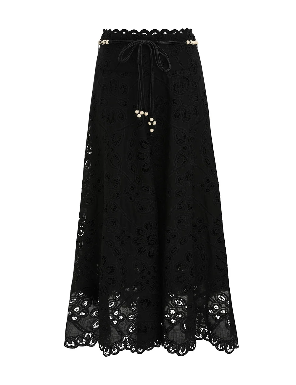 ITEM DETAILS The Rhiannon Embroidered Skirt in Black from our Summer Swim 2025 Collection. A cotton midi skirt featuring scalloped detailing, a removable belt and an invisible zip closure. - 100% cotton fabric - Scallop trim on waistband and hem - Removable wood beaded tie belt - Invisible centre back zip closure with hook and eye Style Code: 4248SSS251 SIZE DETAILS 0P 0 1 2 3 4 Length 28.5 32 32 32 32 32 Waist 24.5 26 28.5 30 32.5 34 Designed to be fitted across the waist, relaxed through the legs This garment fits true to size Available in size 0P, suited to clients who are under 5'3"/ 160cm Model is 5'9.5"/178 cm, bust size 32C/10C and wears a size 0 Item measurements are in inches CARE INSTRUCTIONS Main: 100% cotton; embroidery: 100% polyester; lining: 100% cotton Dry clean only code f (hydrocarbon only); Remove any detachable trims prior to dry cleaning; Cover to protect trim; Cool iron with protective cloth; Light steam only; Do not spot clean Always check the label or care card for specific care instructions.