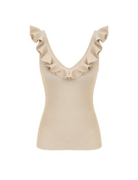 ITEM DETAILS The Rhiannon Frill V-Neck Top in Cream Lurex from our Summer Swim 2025 Collection. A ribbed knit, fitted tank with a frilled v-neckline. - Fitted, ribbed tank - V-neckline with frill Style Code: 4171TSS251 SIZE DETAILS 0P 0 1 2 3 Length 52 56 56 57 57 Bust 42 46 52 56 62 Waist 34 40 44 50 54 Designed to fit close to the body This garment fits true to size Available in size 0P, suited to clients who are under 5'3"/ 160cm Model is 5'9.5"/178 cm, bust size 32C/10C and wears a size 0 Item measurements have been rounded to the nearest cm CARE INSTRUCTIONS 64% viscose 30% polyamide 6% metallized fibre Exclusive of trims Gentle cold hand wash separately with mild detergent Do not bleach Do not soak, wring or rub Do not tumble dry Dry flat inside out, away from direct sunlight Cool iron on reverse Store garment flat, do not hang Dry cleanable code f (hydrocarbon) Always check the garment care label for specific care instructions.