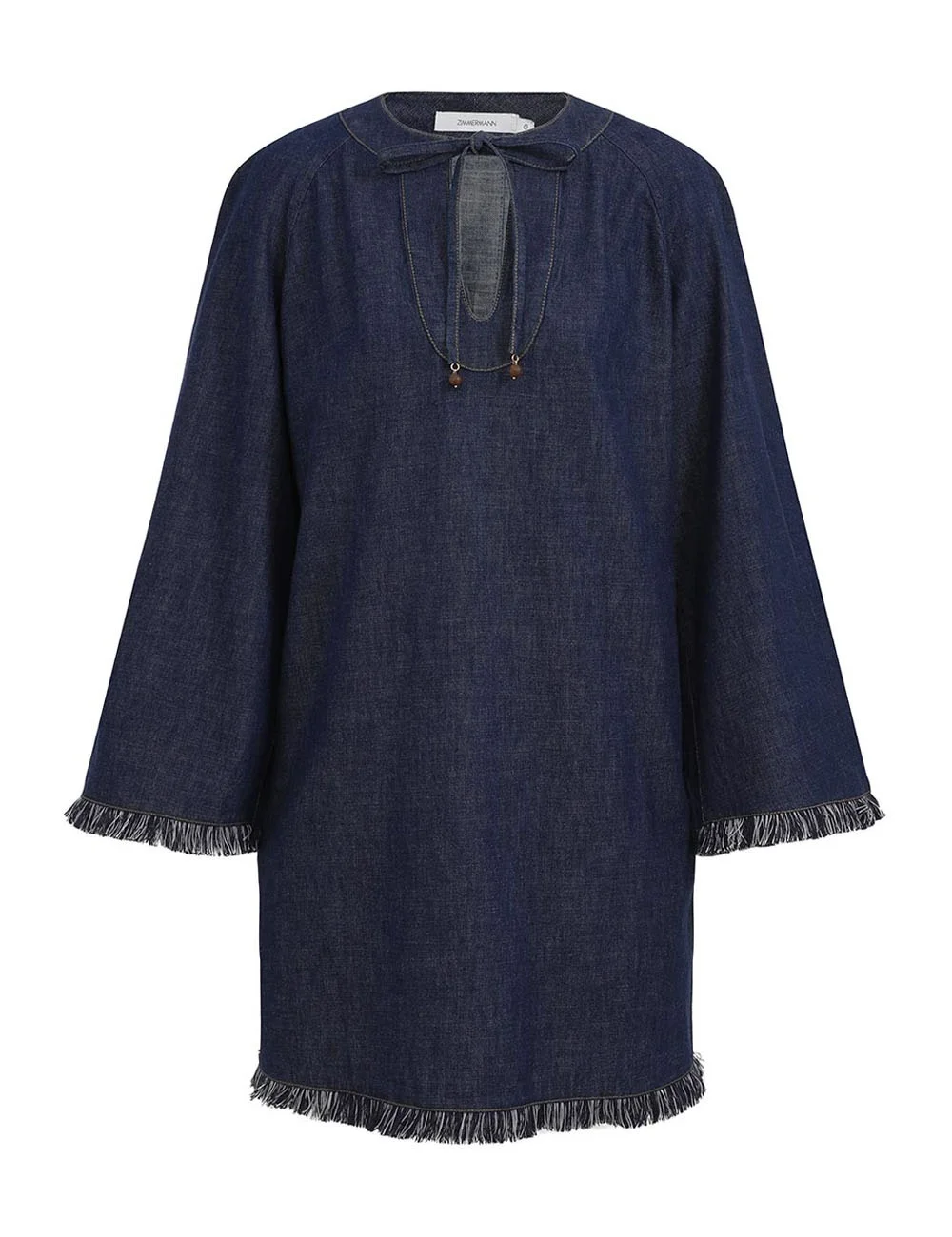 ITEM DETAILS The Rhiannon Fringe Denim Mini in Atlantic from our Summer Swim 2025 Collection. A denim mini dress featuring a keyhole front with self rouleau tie at neckline and long loose fitted sleeves, finished with fringe detailing at cuff and hem. - Denim kaftan dress - Fray trim on sleeve and bottom hem - Front neck scoop with neck tie - Functional side pockets - Slip on style Style Code: 2798DSS251 SIZE DETAILS 0P 0 1 2 3 4 Length 30.5 32.5 33 33.5 33.5 34 Sleeve 26 27.5 28 28.5 28.5 29 Designed for a slightly loose fit, with a closer fit at the bust This garment fits true to size Available in size 0P, suited to clients who are under 5'3"/ 160cm Model is 5'9.5"/178 cm, bust size 32C/10C and wears a size 0 Item measurements are in inches CARE INSTRUCTIONS 100% cotton Gentle cold hand wash separately with mild detergent Remove any detachable trims prior to washing Do not soak, rub or wring Do not bleach Do not tumble dry Dry in shade; Warm iron with protective cloth Do not spot clean; Do not dry clean Always check the label or care card for specific care instructions.