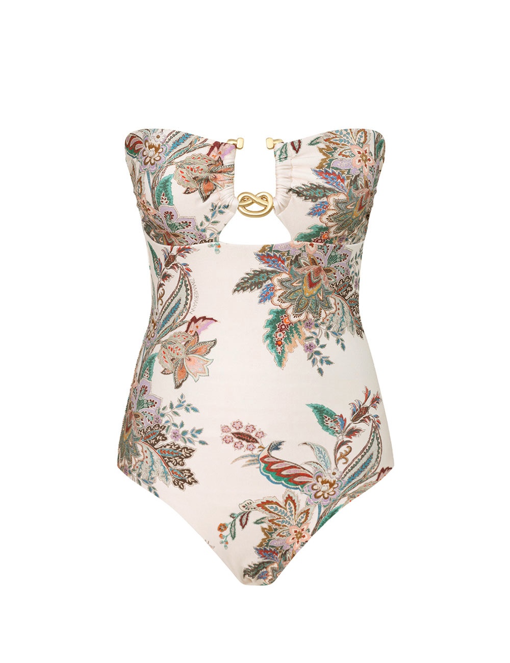 ITEM DETAILS The Rhiannon Knot Trim 1PC in Cream Multi Paisley from our Summer Swim 2025 Collection. A lycra one piece featuring a wire knot detail, gathering at the bust, keyhole feature above waist and adjustable straps. - Lycra one piece swimsuit - Full coverage bottoms - Detachable and adjustable straps - Gathering side front bra between notches - Underwire and side seam boning - Lined Style Code: 4217WSS251 SIZE DETAILS This garment fits true to size Model is 5'10.5"/179 cm, bust size 34C/12C and wears a size 0 CARE INSTRUCTIONS Main: 80% polyamide, 20% elastane; lining: 92% polyamide, 8% elastane Do not roll up when wet; Rinse thoroughly after use; Remove any detachable trims prior to washing; Cold hand wash separately with mild detergent, avoid fabric softener; Dry in shade; Do not bleach or iron; Do not tumble dry; Do not dry clean; Light colours may be transparent when wet; Avoid contact with sunscreens, oils and rough surfaces; Avoid high temperature pools and spas treated with harsh chemicals Always check the label or care card for specific care instructions.