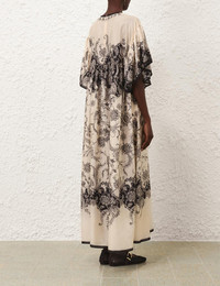 ITEM DETAILS The Rhiannon Maxi Dress in Cream/Black Floral from our Summer Swim 2025 Collection. A silk habutae maxi dress featuring short sleeves with frilled edging, rounded neckline, finished with an invisible zip closure. - 100% silk fabric - Short kaftan sleeves - Heavy gathering under the bodice - Centre back invisible zip closure - Functional side pockets Style Code: 3211DSS251 SIZE DETAILS 0P 0 1 2 3 4 Length 51.5 56.5 56.5 57 57 57.5 Bust 39.5 41.5 43.5 45.5 48 49.5 Designed for a loose fit Light-weight, non-stretchy fabric This garment fits true to size Available in size 0P, suited to clients who are under 5'3"/ 160cm Model is 5'9.5"/178 cm, bust size 32C/10C and wears a size 0 Item measurements are in inches CARE INSTRUCTIONS Main: 100% silk Dry clean only code f (hydrocarbon only); Remove any detachable trims prior to dry cleaning; Cover to protect trim; Cool iron with protective cloth; Light steam only; Do not spot clean Always check the label or care card for specific care instructions.