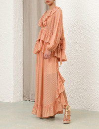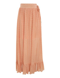 ITEM DETAILS The Rhiannon Metallic Frill Skirt in Peach from our Summer Swim 2025 Collection. A loose fitted midi skirt featuring an elasticated waist, frill detailing and beaded side ties. - Midi length - Elasticated waist with beaded side tie feature - Frilled hem - Side seam pockets - Lined Style Code: 4421SSS251 SIZE DETAILS 0P 0 1 2 3 Length 35 38.5 38.5 38.5 38.5 Waist 36 37 39.5 41.5 43.5 Designed with an elasticated waistband for a flexible fit This garment fits true to size Available in size 0P, suited to clients who are under 5'3"/ 160cm Model is 5'9.5"/178 cm, bust size 32C/10C and wears a size 0 Item measurements are in inches CARE INSTRUCTIONS Main: 94. 4% viscose, 5. 6% metallic; lining: 100% viscose Dry clean only code f (hydrocarbon only); Remove any detachable trims prior to dry cleaning; Cover to protect trim; Cool iron with protective cloth; Light steam only; Do not spot clean Always check the label or care card for specific care instructions.