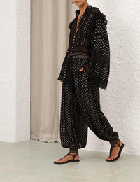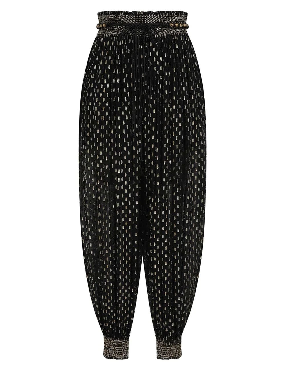 ITEM DETAILS The Rhiannon Metallic Harem Pant in Black from our Summer Swim 2025 Collection. A harem pant featuring an elasticated waist and cuffs with shirring detail throughout. - Harem pant silhouette - Side seam pockets - Comfortable waist fit - Removable self tie beaded belt - Lined Campaign: This style was featured in the Summer Swim 2025 Campaign. Style Code: 3774PSS251 SIZE DETAILS 0P 0 1 2 3 4 Length 34 37 37.5 38 38 38 Waist 24.5 25 27.5 30 31.5 34 Inseam 23 25.5 26 26 26.5 27 Designed with an elasticated waistband and cuff for a flexible fit This garment fits true to size Available in size 0P, suited to clients who are under 5'3"/ 160cm Model is 5'9.5"/178 cm, bust size 32C/10C and wears a size 0 Item measurements are in inches CARE INSTRUCTIONS Main: 94. 4% viscose, 5. 6% metallic; lining: 100% viscose Dry clean only code f (hydrocarbon only); Remove any detachable trims prior to dry cleaning; Cover to protect trim; Cool iron with protective cloth; Light steam only; Do not spot clean Always check the label or care card for specific care instructions.