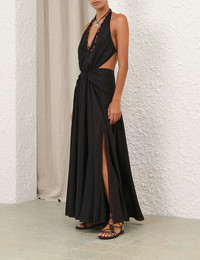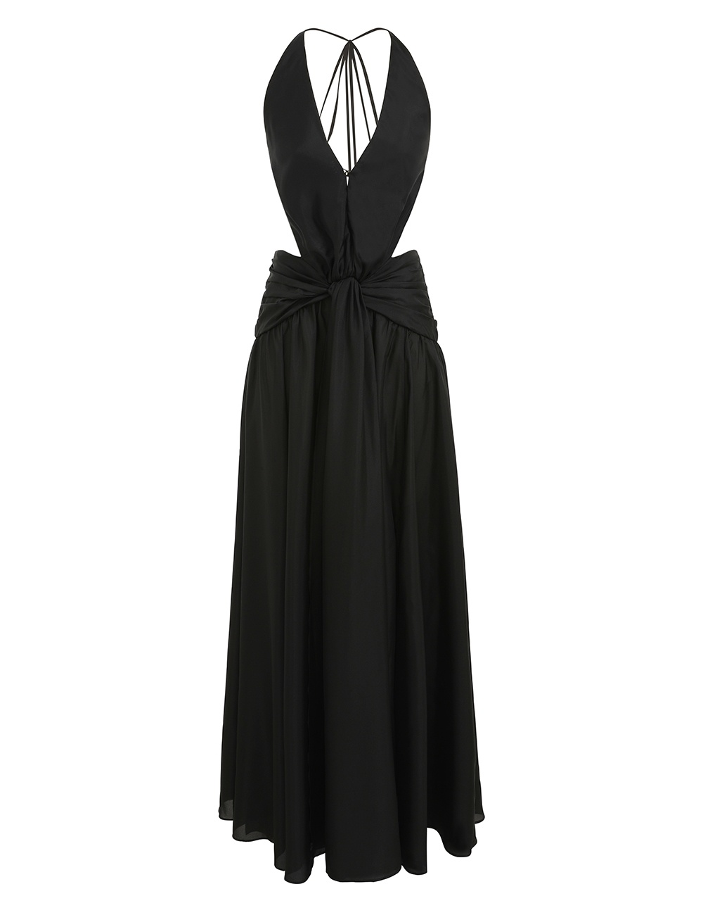 ITEM DETAILS The Rhiannon Plunge Halter Maxi in Black from our Summer Swim 2025 Collection. A silk habutae halter neck maxi dress featuring a dramatic plunging V-neckline, fitted at the waist with exposed sides, an open back with self tie beaded drawstrings, finished with flared skirt detailing. - 100% silk gown - Draping at waist with cut-outs - Internal self covered buttons down the centre front - Invisible centre back closure at the skirt - Front skirt splits - Lined bodice Campaign: This style was featured in the Summer Swim 2025 Campaign. Style Code: 4595DSS251 SIZE DETAILS 0P 0 1 2 3 Length 55.5 60 60 60.5 60.5 Designed with a self tie back and neck, providing a flexible fit at the bust and waist This garment fits true to size Available in size 0P, suited to clients who are under 5'3"/ 160cm Model is 5'9.5"/178 cm, bust size 32C/10C and wears a size 0 Item measurements are in inches CARE INSTRUCTIONS Main: 100% silk, lining: 100% silk Dry clean only code f (hydrocarbon only); Remove any detachable trims prior to dry cleaning; Cover to protect trim; Cool iron with protective cloth; Light steam only; Do not spot clean Always check the label or care card for specific care instructions.