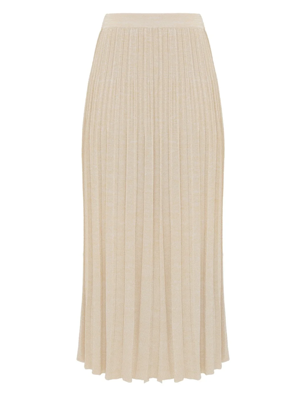 ITEM DETAILS The Rhiannon Rib Midi Skirt in Cream Lurex from our Summer Swim 2025 Collection. A ribbed knit midi skirt featuring an elasticated waistband and soft A-line silhouette. - Ribbed knit - Relaxed midi skirt - Elasticated waistband - Soft A-line silhouette Style Code: 4170SSS251 SIZE DETAILS 0P 0 1 2 3 Length 72 79 79 79 79 Waist 58 60 66 70 76 Hip 140 146 150 156 160 Elastic waist for an easy fit This garment fits true to size Available in size 0P, suited to clients who are under 5'3"/ 160cm Model is 5'9.5"/178 cm, bust size 32C/10C and wears a size 0 Item measurements have been rounded to the nearest cm CARE INSTRUCTIONS 87% viscose 8% polyamide 5% metallized fibre Exclusive of trims Gentle cold hand wash separately with mild detergent Do not bleach Do not soak, wring or rub Do not tumble dry Dry flat inside out, away from direct sunlight Cool iron on reverse Store garment flat, do not hang Dry cleanable code f (hydrocarbon) Always check the garment care label for specific care instructions.
