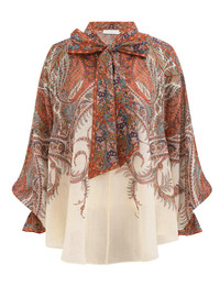 ITEM DETAILS The Rhiannon Tie Neck Blouse in Cream Paisley from our Summer Swim 2025 Collection. A cape style ramie blouse featuring a self tie neck tie, billowed sleeves and shirred elasticated cuffs. - 100% ramie fabric - Long sleeve blouse - Button and loop closure at the front neck - Fitted at cuffs - Self tie neck - Placement print throughout - Comes with separate slip Style Code: 3236TSS251 SIZE DETAILS 0P 0 1 2 3 4 Length 28.5 30.5 30.5 31 31.5 31.5 Sleeve 29 30.5 3141.5 32 32.5 Designed for a relaxed fit This garment fits true to size Available in size 0P, suited to clients who are under 5'3"/ 160cm Model is 5'9.5"/178 cm, bust size 32C/10C and wears a size 0 Item measurements are in inches CARE INSTRUCTIONS Main: 100% ramie; slip: 86% recycled polyester, 14% elastane Dry clean only code f (hydrocarbon only); Remove any detachable trims prior to dry cleaning; Cover to protect trim; Cool iron with protective cloth; Light steam only; Do not spot clean Gentle cold hand wash separately with mild detergent; Remove any detachable trims prior to cleaning; Cover to protect trim; Do not soak, rub or wring; Do not bleach; Dry in shade; Cool iron with protective cloth; Do not tumble dry; Do not spot clean; Dry cleanable code f (hydrocarbon only); Always check the label or care card for specific care instructions.