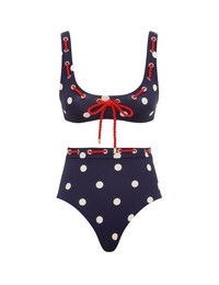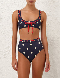ITEM DETAILS The Scarborough Eyelet Bikini in Blue/Ivory Polka Dot from our Summer Swim 2025 Collection. A lycra bikini set featuring a bikini top with a scooped neckline, back clasp and high waisted pant, finished with rope detailing threaded throughout. - Lycra bikini set - Bikini top with eyelets and rope threaded across neckline - High waisted pant with rope and eyelets at waist - Medium coverage - ZIMMERMANN clip fastening at bra centre back - Lined Summer Swim Exclusives: Only available at zimmermann.com and in select boutiques. Style Code: 4649WSS256 SIZE DETAILS This garment fits true to size Model is 5'10.5"/179 cm, bust size 34C/12C and wears a size 0 CARE INSTRUCTIONS Main: 80% polyamide, 20% elastane; lining: 92% recycled nylon, 8% spandex Do not roll up when wet; Rinse thoroughly after use; Remove any detachable trims prior to washing; Cold hand wash separately with mild detergent, avoid fabric softener; Dry in shade; Do not bleach or iron; Do not tumble dry; Do not dry clean; Light colours may be transparent when wet; Avoid contact with sunscreens, oils and rough surfaces; Avoid high temperature pools and spas treated with harsh chemicals Always check the label or care card for specific care instructions.