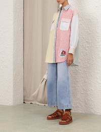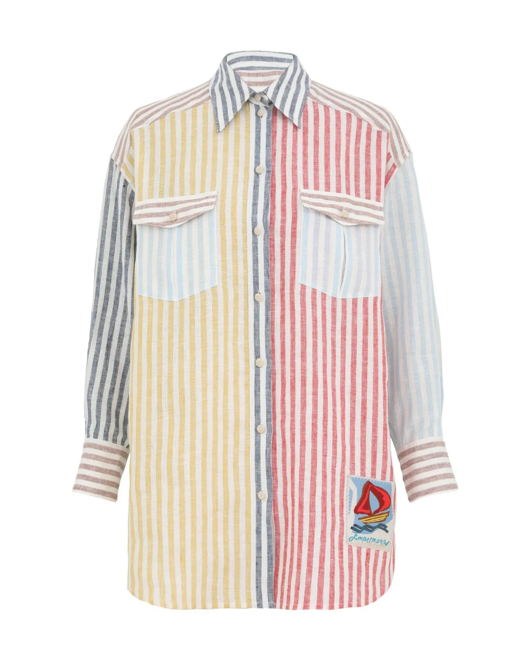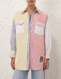 ITEM DETAILS The Scarborough Oversize Man Shirt in Spliced from our Summer Swim 2025 Collection. A long sleeve shirt featuring a classic collar, contrast stripes and buttons down the centre front. - Oversized shirt with tucks on sleeves - Crochet buttons down centre front, cuffs and pockets - Functional front pockets across chest with flaps - Buttons at the sleeve slit Summer Swim Exclusives: Only available at zimmermann.com and in select boutiques. Style Code: 4598TSS256 SIZE DETAILS 0P 0 1 2 3 Length 28.5 30.5 31 31.5 31.5 Bust 50.5 52 54.5 56 58.5 Sleeve 18 19.5 19.5 19.5 19.5 Designed for a relaxed, loose fit This garment fits true to size Available in size 0P, suited to clients who are under 5'3"/ 160cm Model is 5'9.5"/178 cm, bust size 32C/10C and wears a size 0 Item measurements are in inches CARE INSTRUCTIONS Main: 100% linen Dry clean only code f (hydrocarbon only); Remove any detachable trims prior to dry cleaning; Cover to protect trim; Cool iron with protective cloth; Light steam only; Do not spot clean Always check the label or care card for specific care instructions.