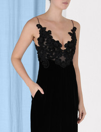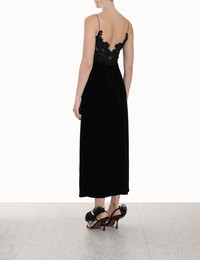 ITEM DETAILS The Sensory Velvet Slip Dress in Black from our Fall 2023 Collection, Luminosity. A velvet midi dress featuring a contrast bodice with motifs of velvet embroidery throughout. - Velvet midi slip dress - Fixed rouleau straps - Deep neckline - Side seam pockets - Exposed zip - Lined Style Code: 8345DF233 SIZE DETAILS 0P 0 1 2 3 4 Length 95 106 106 106 106 106 Bust 79 84 89 94 99 104 Hip 122 126 132 136 142 144 Fitted through bodice and waist Straight fit through skirt This garment fits true to size Available in size 0P, suited to clients who are under 5'3"/ 160cm Model is 5'9.5"/178 cm, bust size 32C/10C and wears a size 0 Item measurements have been rounded to the nearest cm. CARE INSTRUCTIONS Main: 80% viscose 20% silk Exclusive of trims Dry clean only code f with protective bag Do not iron Light steam only Do not spot clean Turn garment inside out before dry cleaning Always check the garment care label for specific care instructions.