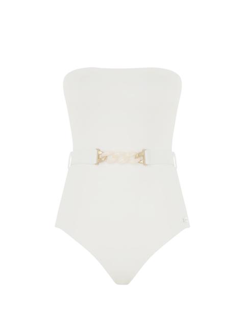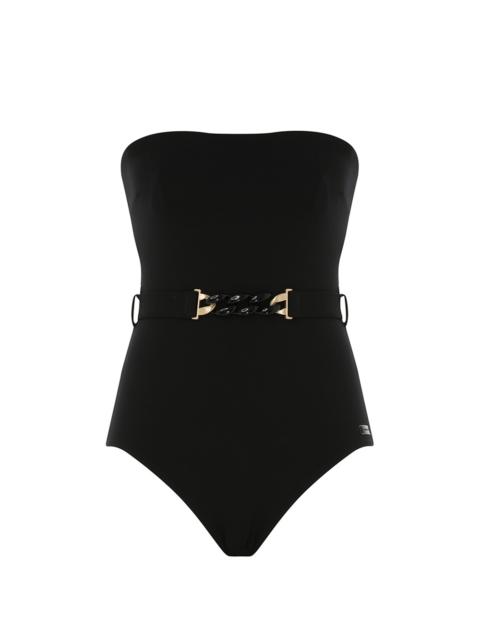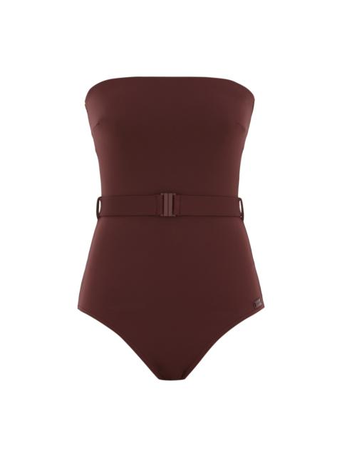 ITEM DETAILS The Separates Bandeau 1PC in Chocolate from our Summer Swim 2025 Collection. A lycra bandeau one piece featuring a shelf bra, boning in the side seams and removable chain trim belt. - Lycra bandeau one piece - Removable and adjustable straps - Rouleau loops with removable waist belt - Midi cut legline - Medium coverage bottom Style Code: 1380WSS25 SIZE DETAILS This garment fits true to size Model is 5'10.5"/179 cm, bust size 34C/12C and wears a size 0 CARE INSTRUCTIONS Main: 62% polyamide, 38% elastane; lining: 92% recycled nylon, 8% spandex Do not roll up when wet; Rinse thoroughly after use; Remove any detachable trims prior to washing; Cold hand wash separately with mild detergent, avoid fabric softener; Dry in shade; Do not bleach or iron; Do not tumble dry; Do not dry clean; Light colours may be transparent when wet; Avoid contact with sunscreens, oils and rough surfaces; Avoid high temperature pools and spas treated with harsh chemicals Always check the label or care card for specific care instructions.