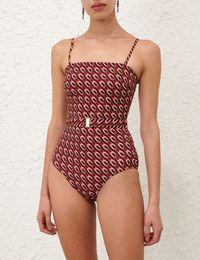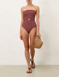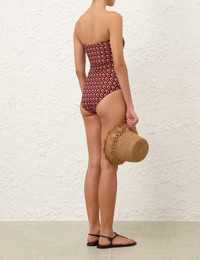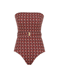 ITEM DETAILS The Separates Bandeau 1PC in Burgundy Multi from our Summer Swim 2025 Collection. A lycra bandeau one piece featuring a shelf bra, boning in the side seams and removable chain trim belt. - Lycra bandeau one piece - Removable and adjustable straps - Rouleau loops with removable waist belt - Midi cut legline - Medium coverage bottom Style Code: 1380WSS25 SIZE DETAILS This garment fits true to size Model is 5'10.5"/179 cm, bust size 34C/12C and wears a size 0 CARE INSTRUCTIONS Main: 62% polyamide, 38% elastane; lining: 92% recycled nylon, 8% spandex Do not roll up when wet; Rinse thoroughly after use; Remove any detachable trims prior to washing; Cold hand wash separately with mild detergent, avoid fabric softener; Dry in shade; Do not bleach or iron; Do not tumble dry; Do not dry clean; Light colours may be transparent when wet; Avoid contact with sunscreens, oils and rough surfaces; Avoid high temperature pools and spas treated with harsh chemicals Always check the label or care card for specific care instructions.