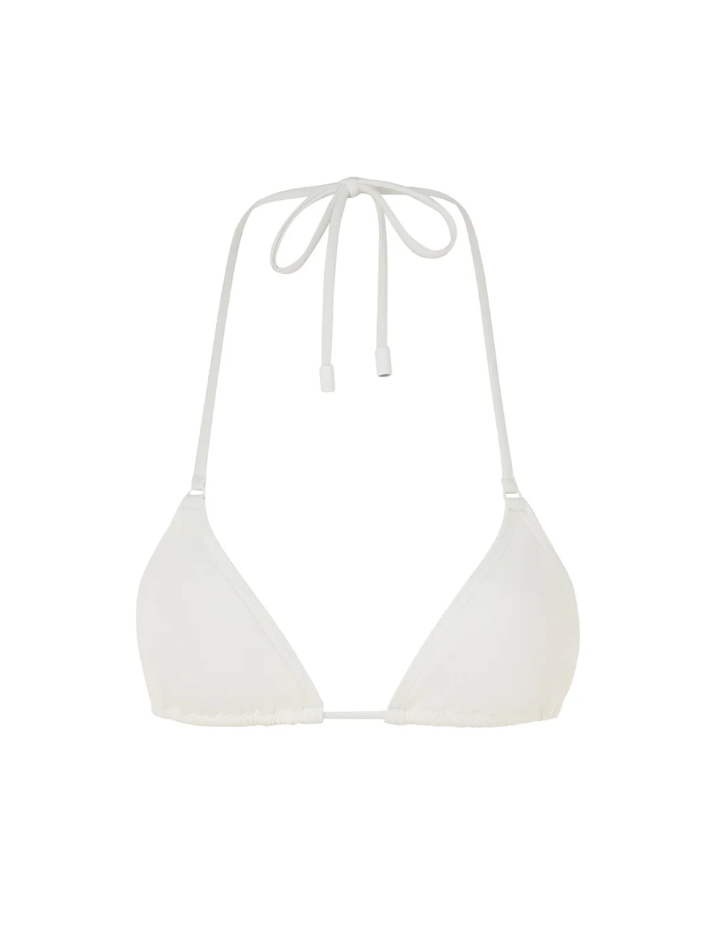 ITEM DETAILS The Separates Mini Tri in Ivory from our Summer Swim 2025 Collection. A triangle bikini top constructed from form-fitting Italian lycra featuring fully adjustable neck and under bust ties finished with toggle ends. - Italian lycra - Mini triangle bikini top - Self tie straps with toggle ends - Adjustable cup placement - Removable soft cups - Top only, pant sold separately Style Code: 1369WSS25 SIZE DETAILS This garment fits true to size Model is 5'10.5"/179 cm, bust size 34C/12C and wears a size 0 CARE INSTRUCTIONS Main: 62% polyamide, 38% elastane; lining: 92% polyamide, 8% elastane Do not roll up when wet; Rinse thoroughly after use; Remove any detachable trims prior to washing; Cold hand wash separately with mild detergent, avoid fabric softener; Dry in shade; Do not bleach or iron; Do not tumble dry; Do not dry clean; Light colours may be transparent when wet; Avoid contact with sunscreens, oils and rough surfaces; Avoid high temperature pools and spas treated with harsh chemicals Always check the label or care card for specific care instructions.