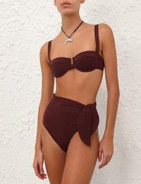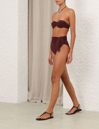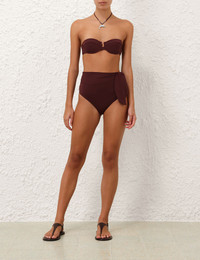 ITEM DETAILS The Separates Scarf HW Pant in Chocolate from our Summer Swim 2025 Collection. A high waisted bikini pant constructed from form-fitting Italian lycra featuring a self-tie detail at the side waist. - Italian lycra - High waisted bikini pant - Adjustable scarf tie detail at left side - High cut legline - Medium Coverage - Pant only, bra sold separately Style Code: 1373WSS25 SIZE DETAILS This garment fits true to size Model is 5'10.5"/179 cm, bust size 34C/12C and wears a size 0 CARE INSTRUCTIONS Main: 62% polyamide, 38% elastane; lining: 92% polyamide, 8% elastane Do not roll up when wet; Rinse thoroughly after use; Remove any detachable trims prior to washing; Cold hand wash separately with mild detergent, avoid fabric softener; Dry in shade; Do not bleach or iron; Do not tumble dry; Do not dry clean; Light colours may be transparent when wet; Avoid contact with sunscreens, oils and rough surfaces; Avoid high temperature pools and spas treated with harsh chemicals Always check the label or care card for specific care instructions.