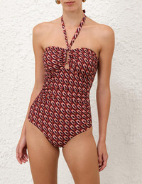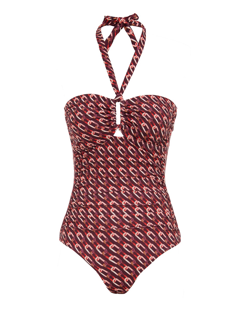 ITEM DETAILS The Separates Wide Link 1PC in Burgundy Multi from our Summer Swim 2025 Collection. A halter neck one piece with ruching throughout the body and wide link detail at centre bust. - Italian lycra - Bandeau, halter one piece - Full coverage bottoms - Wide link detail at centre bust - Removable cups - Gripper elastic and boning for hold and bust support Style Code: 1377WSS25 SIZE DETAILS This garment fits true to size Model is 5'10.5"/179 cm, bust size 34C/12C and wears a size 0 CARE INSTRUCTIONS Main: 62% polyamide, 38% elastane, lining: 92% recycled nylon, 8% spandex Do not roll up when wet; Rinse thoroughly after use; Remove any detachable trims prior to washing; Cold hand wash separately with mild detergent, avoid fabric softener; Dry in shade; Do not bleach or iron; Do not tumble dry; Do not dry clean; Light colours may be transparent when wet; Avoid contact with sunscreens, oils and rough surfaces; Avoid high temperature pools and spas treated with harsh chemicals Always check the label or care card for specific care instructions.