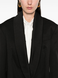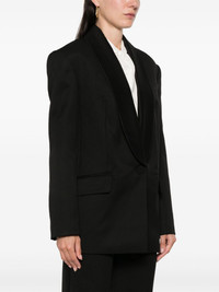 shawl tux blazer Highlights - Black - Wool blend - Front button fastening - Tailored design - Shawl lapels - Chest welt pocket - Shoulder pads - Long sleeves - Buttoned cuffs - Two front flap pockets - American rear vent - Full lining - Straight hem Imported Composition Lining: Viscose 75%, Silk 25% Outer: Wool 51%, Polyester 49% Washing instructions Dry Clean Only
