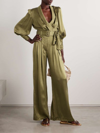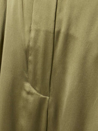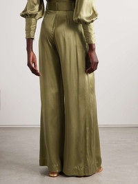 Zimmermann's pants are made from silk-satin that drapes effortlessly and shines beautifully in the light. Pleated to enhance the wide legs, they're topped with a coordinating belt that emphasizes the high waist. Wear them with the matching top in our edit for a monochrome outfit. Size & Fit - 00 (petite) = UK 6/ US 2/ FR 34 (under 5’3”/ 160cm) - 0 = UK 8/ US 4/ FR 36 - 1 = UK 10/ US 6/ FR 38 - 2 = UK 12/ US 8/ FR 40 - 3 = UK 14/ US 10/ FR 42 - 4 = UK 16/ US 12/ FR 44 - Fits true to size, take your normal size - High-rise, cut for a wide-leg fit - Lightweight, non-stretchy fabric - Model is 177cm/ 5'10" and is wearing the designer's size 0 Model measurements: - Bust: 80cm/ 32" - Waist: 61cm/ 24" - Hip: 86cm/ 34" Details & Care - Army-green silk-satin - Concealed button, hook and zip fastening at front - 100% silk