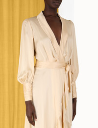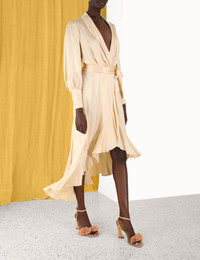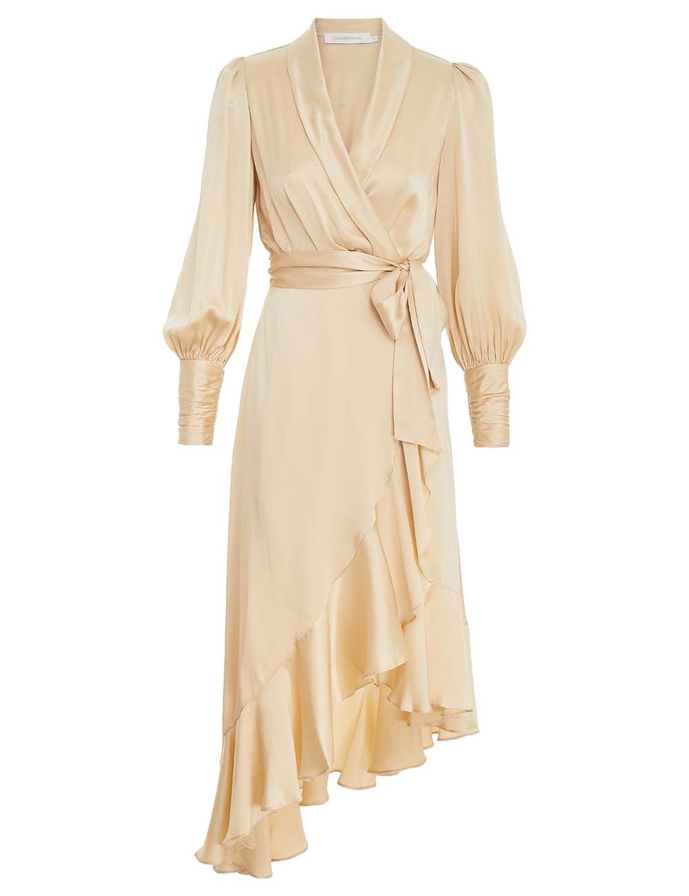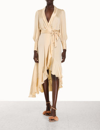 ITEM DETAILS The Silk Wrap Midi Dress in Cream from our Spring 2023 Collection, Wonderland. A silk midi dress featuring a wrap front silhouette, blouson sleeves with elongated cuffs and asymmetric skirt. - Silk midi dress - Wrap front - Asymmetric ruffled mini skirt - Blouson sleeves with elongated cuffs Style Code: 8066DRWON STYLING Style the Silk Wrap Midi Dress with the Quartz Sunflower Earrings and Embellished Sandal 85 for your next special occasion. Wear this style with the Embellished Sandal 85 and Popcorn Pave Earrings by ZIMMERMANN SIZE DETAILS 0P 0 1 2 3 4 Length 120 120 129 130 131 131 Waist 52 56 60 64 68 70 Sleeve 49 53 54 55 55 56 This garment fits true to size, we recommend you select your normal size. Wrap style for an adjustable and easy fit. Available in size 0P, specially designed with petite proportions that are suited to clients who are under 5'3""/ 160cm. Our model is 5'9.5"" / 178 cm, bust size 32C/10C and is wearing a size 0. CARE INSTRUCTIONS 100% silk Exclusive of trims Dry clean only code p with protective bag Cool iron on reverse Do not spot clean Always check the garment care label for specific care instructions.