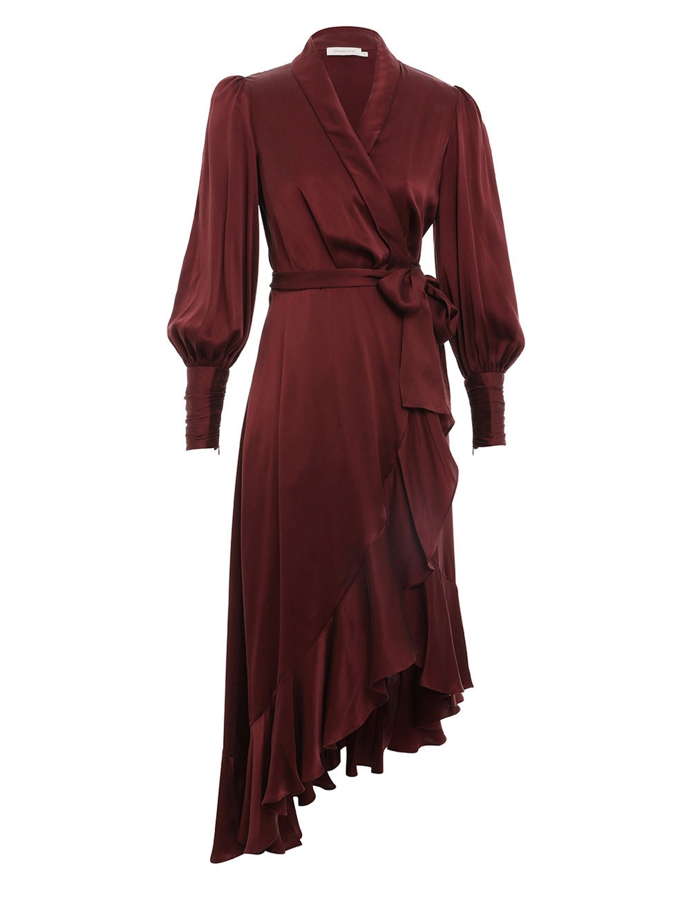 ITEM DETAILS The Silk Wrap Midi Dress in Burgundy from our Fall 2022 Collection, Stargazer. This silk midi dress has a wrap front silhouette and fluid asymmetric skirt. - Sandwash silk midi - Wrap front - Asymmetric ruffled midi skirt - Blouson sleeves with zip down deep sleeve cuffs Style Code: 8066DRKAL STYLING Style the dress with the Velvet Platform Sandal or pair with the Crescent Slingback Pump and collection jewellery to wear to your next celebration. Wear this style with the Crescent Chain Sandal, Eclipse Necklace and Star and Moon Studs by ZIMMERMANN SIZE DETAILS 0P 0 1 2 3 4 Bust 82 87 92 97 102 105 Waist 52 55 59 62 66 72 Length 119 128 129 130 130 132 Sleeve 49 53 54 54 55 57 This garment fits true to size, we recommend you select your normal size. Wrap silhouette for an easy fit. Available in size 0P, specially designed with petite proportions that are suited to clients who are under 5'3"/ 160cm. Our model is 5'9.5" / 178 cm, bust size 32C/10C and is wearing a size 0. CARE INSTRUCTIONS 100% silk Exclusive of trims Dry clean only code p with protective bag Cool iron on reverse Do not spot clean Always check the garment care label for specific care instructions