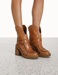 ITEM DETAILS The Stacked Clog Boot in Tan from our Resort Swim 2023 Collection. A leather clog style boot featuring a cylindrical heel and contrast stitching. - Clog style boot - Leather - Cylindrical heel - Contrast stitching - Made in Italy - 75mm heel Style Code: 4422S23 STYLING Style the Stacked Clog Boot with high waisted denim jeans and a ZIMMERMANN blouse for a cool weekend look. SIZE DETAILS This shoe fits true to size, we recommend you select your normal size. 75mm heel. CARE INSTRUCTIONS 100% cow leather upper 100% stacked cow leather heel Exclusive of trims. This item was hand crafted using genuine leather. Leather can alter or stain if in contact with humidity or atmospheric agents. Marks or irregularities in natural hides can appear in even the most luxurious skins. These are naturally occurring features and should not be thought of as imperfections. On occasion leather can stain clothing or other objects it comes into contact with. To maintain in best condition, avoid direct exposure to light and heat, oils, perfume and cosmetics and store at room temperature. Always check the garment care card for specific care instructions.