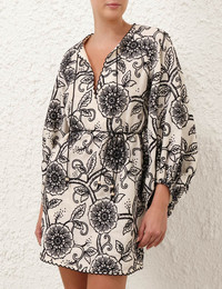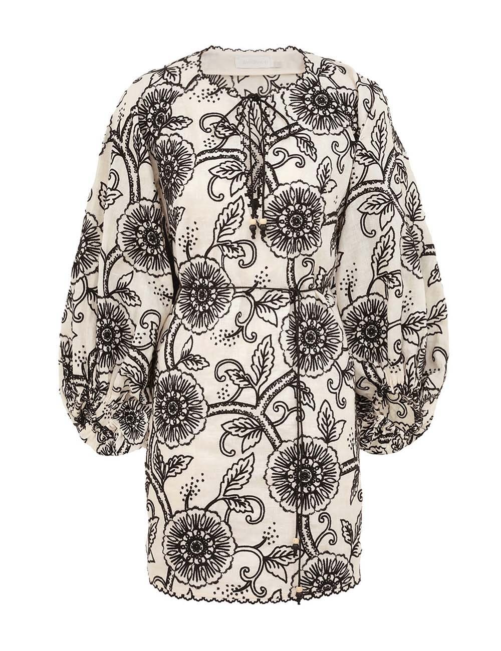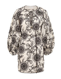 ITEM DETAILS The Tallow Embroidered Mini Dress in Ivory/Black from our Resort Swim 2025 Collection. A linen mini dress featuring a V-neckline with self tie neck tie, raglan sleeves with elasticated cuffs and scalloped embroidery detailing throughout. - Linen mini dress - Removable self tie belt - Side seam pockets - Long raglan sleeves with elasticated cuffs - Invisible zip at left side seam Style Code: 1784DRS253 SIZE DETAILS 0P 0 1 2 3 Length 32 34.5 34.5 35 36 Bust 34.5 35.5 39 41 43 Sleeve 23.5 25.5 25.5 26 26.5 Fitted through the bust and waist This garment fits true to size Available in size 0P, suited to clients who are under 5'3"/ 160cm Model is 5'9.5"/178 cm, bust size 32C/10C and wears a size 0 Item measurements are in inches CARE INSTRUCTIONS Main: 100% linen, embroidery: 100% polyester Dry clean code f (hydrocarbon only), inside out in a protective bag; Remove detachable trims and accessories prior to cleaning; Cover to protect hardware; Cool iron with protective cloth; Do not spot clean; Always check the label or care card for specific care instructions.
