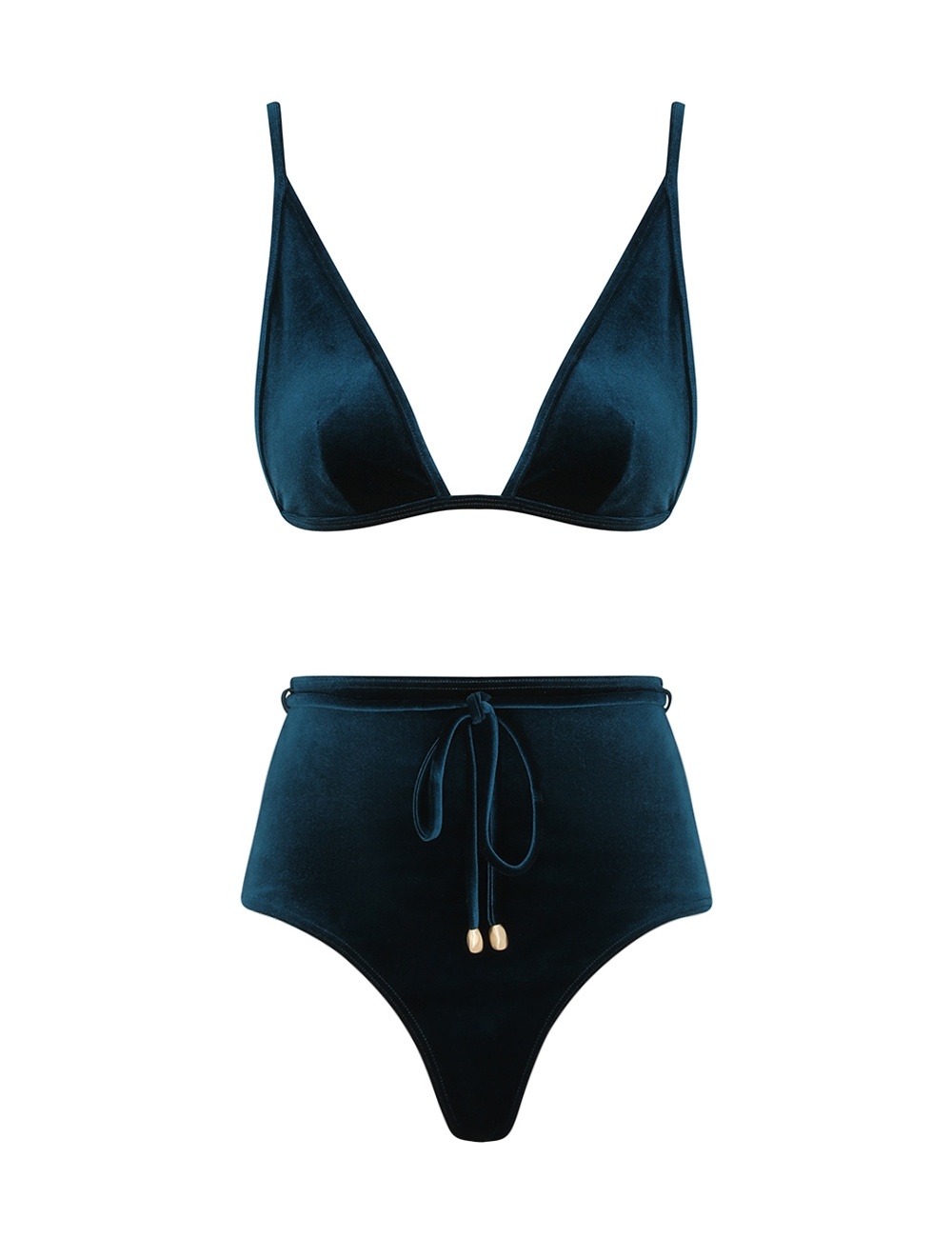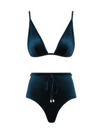 ITEM DETAILS The Tallow Velvet Tri Bikini in Dark Teal from our Resort Swim 2025 Collection. A velvet bikini set featuring a triangle top with adjustable straps and high waisted pant. - Velvet bikini set - Triangle top - High waisted pant - Adjustable straps - Self tie belt with toggle ends on pant - Centre back clasp closure Campaign: This style was featured in the Resort Swim 2025 Campaign. Style Code: 1541WRS253 SIZE DETAILS This garment fits true to size Model is 5'10.5"/179 cm, bust size 34C/12C and wears a size 0 CARE INSTRUCTIONS Main: 95% polyester, 5% elastane, binding: 80% polyamide, 20% elastane, lining: 92% polyamide, 8% elastane, binding: 95% polyester, 5% elastane Do not roll up when wet; Rinse thoroughly after use; Cold hand wash separately with mild detergent, avoid fabric softener; Dry in shade; Do not bleach or iron; Do not tumble dry; Do not dry clean; Light colours may be transparent when wet; Avoid contact with suntan lotions, oils and rough surfaces; Avoid high temperature pools and spas treated with harsh chemicals; Always check the label or care card for specific care instructions.