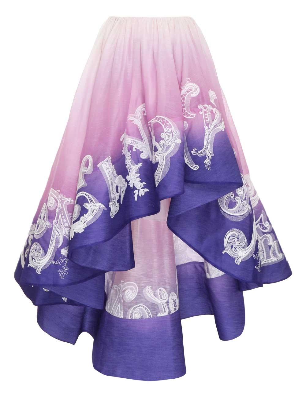 ITEM DETAILS The Tama Wrap Midi Skirt in Purple Ombre from our Spring 2023 Collection, Wonderland. A silk linen organza midi skirt featuring an asymmetric hem and embroidered lettering throughout. - Silk linen organza skirt - Crinoline tape in hem - Invisible zip closure - Cotton voile lining Style Code: 6337STAM STYLING The Tama Wrap Midi Skirt appeared in look 1 of the Spring 2023 Runway. Style the skirt with the Tama Lace Up Corset, Tangled Collage Chain Necklace and Jelly Bow Wedge to complete the runway look. Wear this style with the Jelly Bow Sandal, Tangled Collage Chain Necklace and Tama Lace Up Corset by ZIMMERMANN SIZE DETAILS 0P 0 1 2 3 4 Length 98 98 107 107 107 107 Waist 70 74 78 84 90 94 Fitted across waist, relaxed through skirt. This garment fits true to size, we recommend you select your normal size. Available in size 0P, specially designed with petite proportions that are suited to clients who are under 5'3""/ 160cm. Our model is 5'9.5"" / 178 cm, bust size 32C/10C and is wearing a size 0. CARE INSTRUCTIONS Main: 52% linen 48% silk Lining: 100% cotton Exclusive of trims Dry clean only code f with protective bag Cool iron with protective cloth Light steam only Do not spot clean Turn garment inside out before dry cleaning Always check the garment care label for specific care instructions.