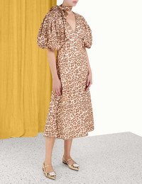 ITEM DETAILS The Tie Neck Midi Dress in Toffee Leopard from our Fall 2023 Collection, Luminosity. . A linen midi dress featuring a V-neckline, elbow length blouson sleeves and a neck tie. - Linen midi dress - Empire silhouette - Short blouson sleeves with elasticated cuffs - Invisible zip at centre back - Lined - Removable neck tie Style Code: 1196DRF23 SIZE DETAILS 0P 0 1 2 3 4 Length 113 122 122 123 124 124 Bust 80 86 90 96 100 106 Hip 96 100 106 110 116 120 Sleeve 51 54 55 56 57 58 Fitted through bust Relaxed through waist and legs This garment fits true to size Available in size 0P, suited to clients who are under 5'3"/ 160cm Model is 5'9.5"/178 cm, bust size 32C/10C and wears a size 0 Item measurements have been rounded to the nearest cm. CARE INSTRUCTIONS Main: 100% linen Exclusive of trims Dry clean only code p with protective bag Cover and protect hardware Cool iron on reverse Do not spot clean Always check the garment care label for specific care instructions.