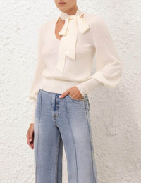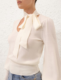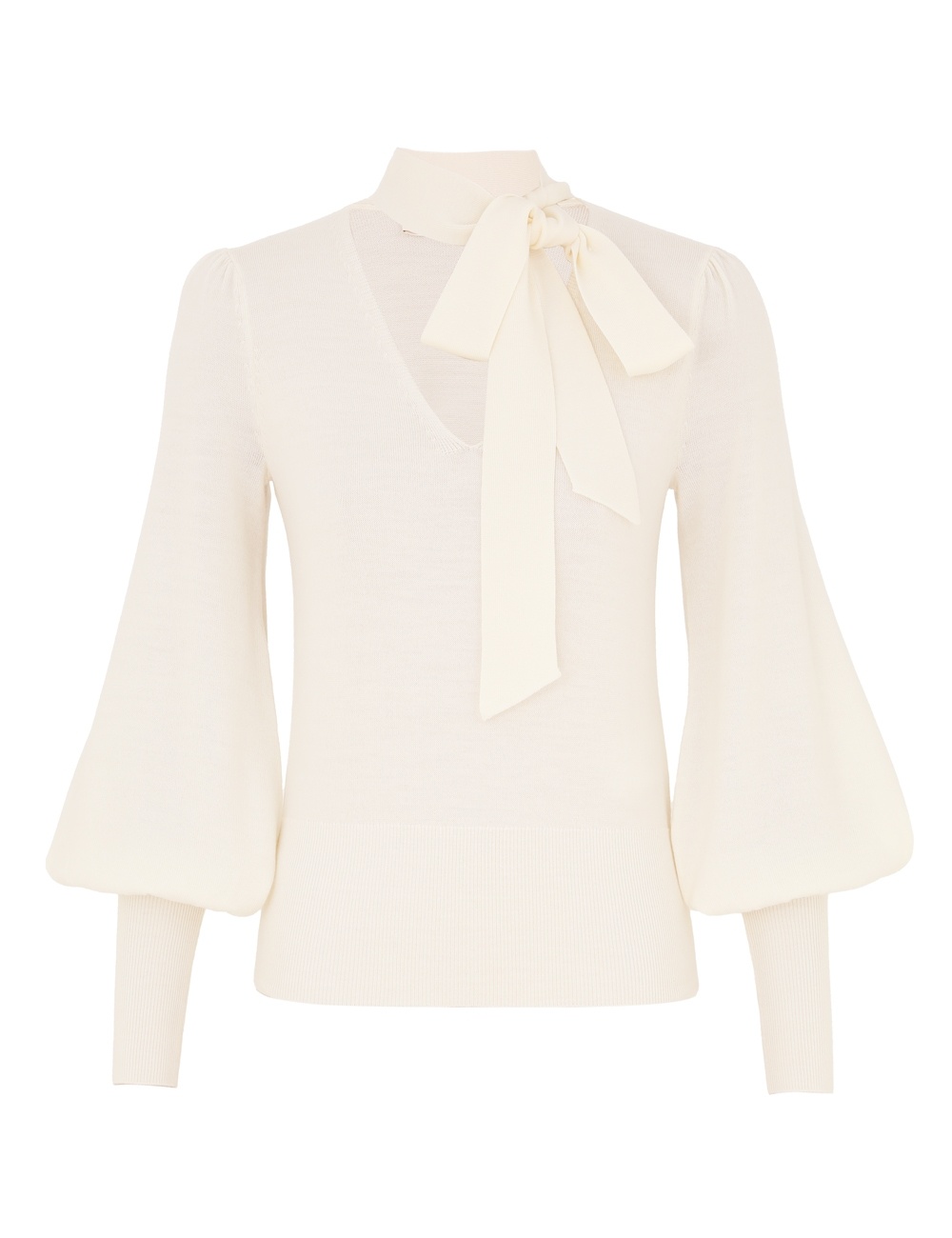 ITEM DETAILS The Tie Neck Sweater in Cream from our Spring 2025 Collection, Illumination. A wool sweater featuring blouson sleeves with elongated ribbed cuffs, a ribbed fitted waistband and a V-neckline with self tie neck tie. - Wool sweater - Blouson sleeves - Elongated ribbed cuffs - Ribbed fitted waistband - V-neckline - Self tie neck tie Style Code: 9981TS25R SIZE DETAILS 0P 0 1 2 3 4 Length 51 55 55 56 56 57 Bust 78 83 88 93 98 103 Sleeve 62 65 66 67 67 68 Slim fit This garment fits true to size Available in size 0P, suited to clients who are under 5'3"/ 160cm Model is 5'9.5"/178 cm, bust size 32C/10C and wears a size 0 Item measurements have been rounded to the nearest cm CARE INSTRUCTIONS 100% wool Dry clean only code f (hydrocarbon only); Remove any detachable trims prior to dry cleaning; Cover to protect trim; Cool iron with protective cloth; Do not spot clean; Store garment flat do not hang Always check the label or care card for specific care instructions.