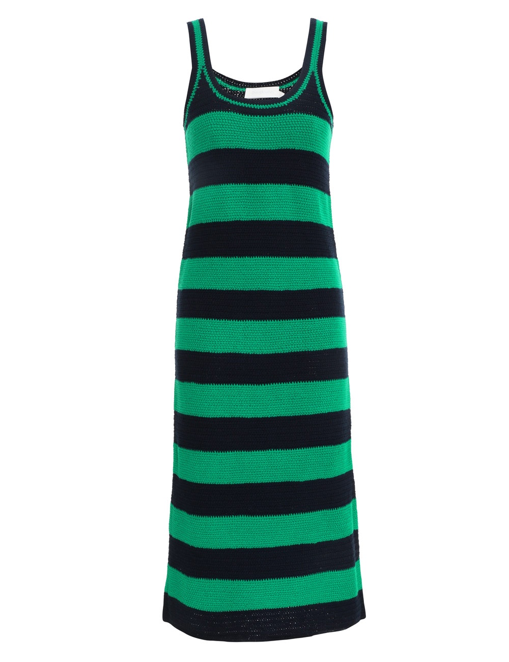 ITEM DETAILS The Tiggy Scoop Neck Midi Dress in Navy/Green Stripe from our Resort Swim 2023 Collection. A hand crocheted midi dress featuring contrast stripes and a scoop neck. - Midi dress - Hand crochet - Scoop neck - Slip on style Style Code: 5110DTIG STYLING Style the Tiggy Scoop Neck Midi Dress with white sneakers and your favourite sunglasses for an easy weekend look. Wear this style with the Bucket Hat, Long Wrap Pearl Hoops and Scuba Flat Sandal by ZIMMERMANN SIZE DETAILS 0P 0 1 2 3 Length 101 108 108 109 110 Bust 74 80 84 90 94 Waist 80 86 90 96 100 This garment fits true to size, we recommend you select your normal size. Available in size 0P, specially designed with petite proportions that are suited to clients who are under 5'3""/ 160cm. Our model is 5'9.5"" / 178 cm, bust size 32C/10C and is wearing a size 0. CARE INSTRUCTIONS 100% cotton Exclusive of trims Gentle cold hand wash separately with mild detergent Do not bleach Do not soak, wring or rub Do not tumble dry Dry flat inside out, away from direct sunlight Cool iron on reverse Store garment flat, do not hang Always check the garment care label for specific care instructions