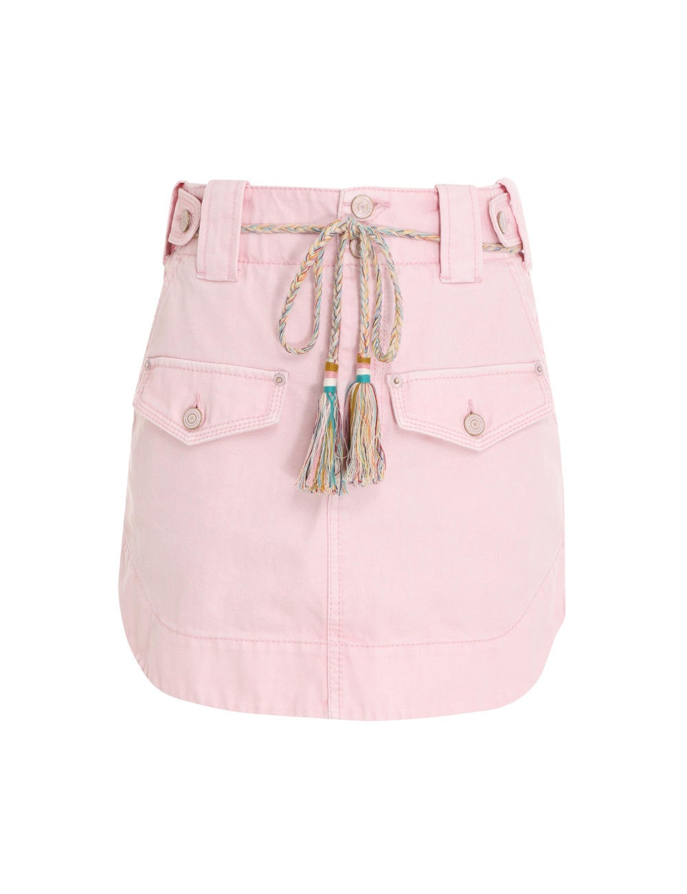 ITEM DETAILS The Tiggy Utility Denim Skirt in Lilac Snow from our Resort Swim 2023 Collection. A denim mini skirt featuring a high waisted silhouette, double button closure and back patch pockets. - Denim mini skirt - High waisted - Double button closure - Topstitching - Front and back patch pockets - Comes with removable belt Style Code: 5205STIG STYLING Style the Tiggy Utility Denim Skirt with the Tiggy Lantern Sleeve Shirt and Scuba Flat Sandal for your next weekend out and about. Wear this style with the Jacquard Towel Bucket Hat, Braided Nappa Clog and Tiggy Lantern Sleeve Shirt by ZIMMERMANN SIZE DETAILS 0P 0 1 2 3 Length 39 41 41 41 41 Waist 64 68 72 78 84 Hip 92 98 102 108 114 This garment fits true to size, we recommend you select your normal size. Available in size 0P, specially designed with petite proportions that are suited to clients who are under 5'3""/ 160cm. Our model is 5'9.5"" / 178 cm, bust size 32C/10C and is wearing a size 0. CARE INSTRUCTIONS Main: 100% cotton Exclusive of trims Remove belt before laundering Gentle cold hand wash separately with mild detergent Do not bleach Do not soak, wring or rub Do not tumble dry Dry flat inside out, away from direct sunlight Cool iron on reverse Always check the garment care label for specific care instructions