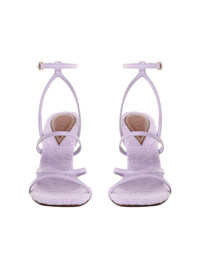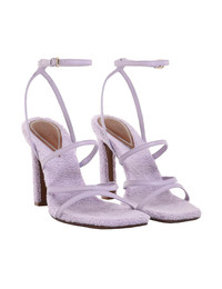 ITEM DETAILS The Towelling Sandal 100 in Lilac from our Spring 2023 Collection, Wonderland. A strappy heeled sandal in towelling fabric with an open square toe. - 100% leather upper and lining - Cloth towelling insole and heel - Buckle fastening ankle strap - 100mm heel - Made in Italy Style Code: 4544S23 STYLING Style the Towelling Sandal 100 with a mini dress and essential jewellery for an elevated event look. SIZE DETAILS This shoe fits true to size, we recommend you select your normal size. CARE INSTRUCTIONS 100% calf leather upper 100% poly towel insole 100% calf leather outsole Knitwear care Due to the delicate nature of some yarns please take extra care when wearing. Avoid sharp objects and/ or corners which may damage, pull or destroy the construction of the knit. It may be required to use a special comb to remove âpillingâ that can build up on the surface during wear. To assist in maintenance of your shoes, always comb in the direction of the knit columns. Please take extra care with specialty knits that may have embellishment, for example, embroidery, crochet, applique, mesh, lace, tassels or textured finishes. Please avoid harsh chemical cleaners and heavy moisture. Please spot clean with a water based cleaner and keep stored in a dust bag away from light and moisture. Leather care This item was handcrafted using genuine leather. Leather can alter or stain if in contact with humidity or atmospheric agents. Marks or irregularities in natural hides can appear in even the most luxurious skins. These are naturally occurring features and should not be thought of as imperfections. On occasion leather can stain clothing or other objects it comes into contact with. To maintain in best condition, avoid direct exposure to light and heat, water, oils, perfume and cosmetics and store at room temperature. Always check the garment care label for specific care instructions.