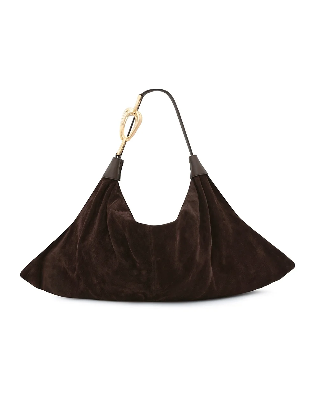 ITEM DETAILS Inspired by the softness of a scarf, the Trampoline Hobo creates a supple, modern draping effect that embraces the body. Its relaxed silhouette is elevated by soft-grained leather handles and a bespoke organic chain-link hardware. Part of the Trampoline line, it blends natural texture with modern elegance, making it the perfect companion for everyday wear. - Suede - Cotton drill lining - Shoulder-carry and hand-carry - Double-zip closure, internal slip pocket - Made in Romania Style Code: 4472XS25A1 SIZE DETAILS Length: 71cm Height: 38cm Handle Drop: 24cm CARE INSTRUCTIONS Main: 100% leather lining: 100% cotton trim: 100% leather Suede care Handcrafted from genuine suede, this item may discolor or stain if exposed to humidity or atmospheric conditions Use a soft-bristled brush to remove soil and a stain repellent Avoid contact with light, heat, water, oils, perfume, and cosmetics Store in a dry environment in the original dust bag Always check the label or care card for specific care instructions.