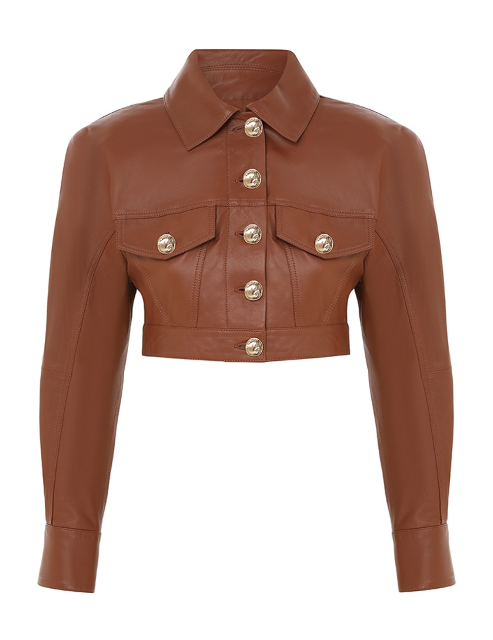 ITEM DETAILS The Tranquillity Leather Jacket in Toffee from our Spring 2024 Collection, Natura. A cropped leather jacket featuring a classic collar with zig-zag topstitching, raglan sleeves and buttons down centre front. - Leather jacket - Cropped silhouette - Long sleeve with buttons on cuff - Flap pockets along front yoke seam - Lined Style Code: 9898JS243 SIZE DETAILS 0P 0 1 2 3 4 Length 49 53 53 53 53 53 Bust 74 78 84 88 92 98 Waist 64 66 72 76 82 86 Cropped fit This garment fits true to size Available in size 0P, suited to clients who are under 5'3"/ 160cm Model is 5'9.5"/178 cm, bust size 32C/10C and wears a size 0 Item measurements have been rounded to the nearest cm. CARE INSTRUCTIONS Main: genuine lamb leather Lining: 75% viscose 25% silk Exclusive of trims Clean professionally by a specialist leather and suede expert Do not wash Do not bleach Do not tumble dry Do not iron Do not spot clean Do not dry clean Avoid water Due to the nature of this garment, colour may transfer onto clothing, accessories or furnishings Always check the garment care label for specific care instructions.