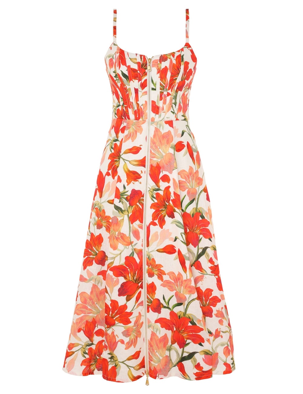 ITEM DETAILS The Tranquillity Zipped Midi Dress in Red Lily from our Spring 2024 Collection, Natura. A linen midi dress featuring an open end zip, shirred back panel and adjustable shoulder straps. - Linen midi dress - Centre front zip - A-line skirt silhouette - Adjustable shoulder strap - Fitted bodice Style Code: 6408DS243 SIZE DETAILS 0P 0 1 2 3 4 Length 85 95 95 95 95 95 Bust 90 75 80 85 90 95 Waist 61 64 69 74 80 85 Fitted at the bust with a shirred back panel and adjustable straps for an easy fit Mid-weight, non-stretchy fabric This garment fits true to size Available in size 0P, suited to clients who are under 5'3"/ 160cm Model is 5'9.5"/178 cm, bust size 32C/10C and wears a size 0 Item measurements have been rounded to the nearest cm. CARE INSTRUCTIONS Main: 100% linen Lining: 100% cotton Exclusive of trims Dry clean only code f (hydrocarbon) with protective bag Cool iron with protective cloth Light steam only Do not spot clean Cover and protect hardware Turn garment inside out before dry cleaning Always check the garment care label for specific care instructions.