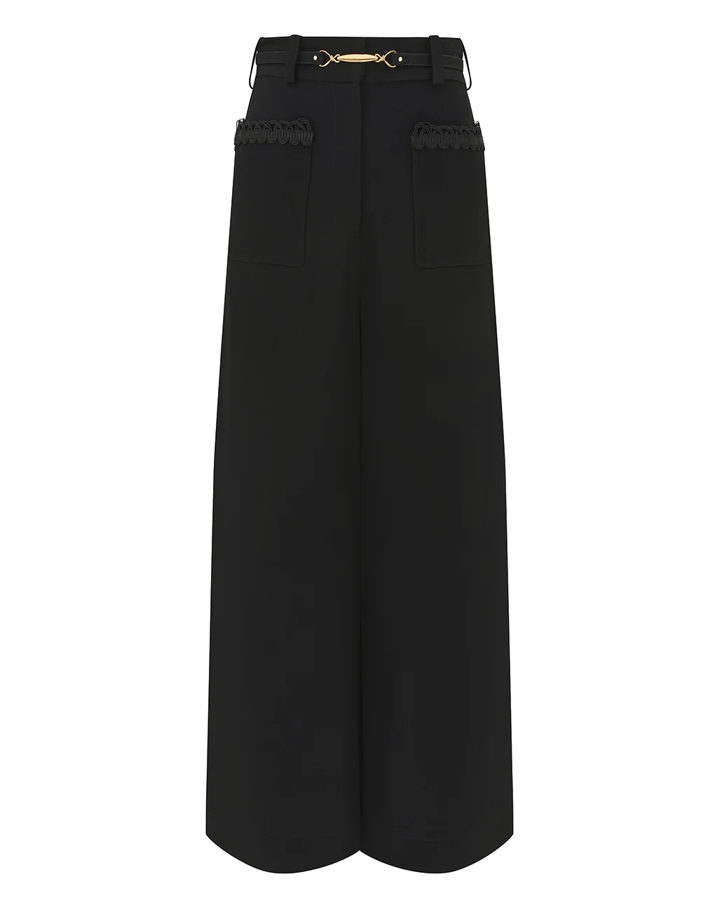 ITEM DETAILS The Trim Culotte Pant in Black from our Spring 2026 Collection, Kindred Spirit. A mid-rise pant featuring a fixed waistband with belt loops, slim chain waist belt, finished with front patch pockets and a flared hem. - Mid-rise, three-quarter length pant - Slim waist belt with centre front gold chain - Patch pockets with rouleau loop trim - Wide leg silhouette - Lined Style Code: 8871PS26R SIZE DETAILS 0P 0 1 2 3 4 Length 34.5 37.5 37.5 38 38 38 Waist 25 27 29 30.5 33 34.5 Hip 36 38.5 40 42.5 44 46.5 Inseam 23.5 26 26 26 26 26 Fitted at the waist, relaxed through the legs Mid-rise waist with a cropped-length leg Mid-weight, non-stretchy fabric This garment fits true to size Available in size 0P, suited to clients who are under 5'3"/ 160cm Model is 5'9.5"/178 cm, bust size 32C/10C and wears a size 0 Item measurements are in inches CARE INSTRUCTIONS Crm main: 100% viscose; lining: 100% viscose blk main: 100% viscose Dry clean only code f (hydrocarbon only); Remove any detachable trims prior to dry cleaning; Cover to protect trim; Do not steam; Iron in low temperature with protective cloth; Do not spot clean Always check the label or care card for specific care instructions.