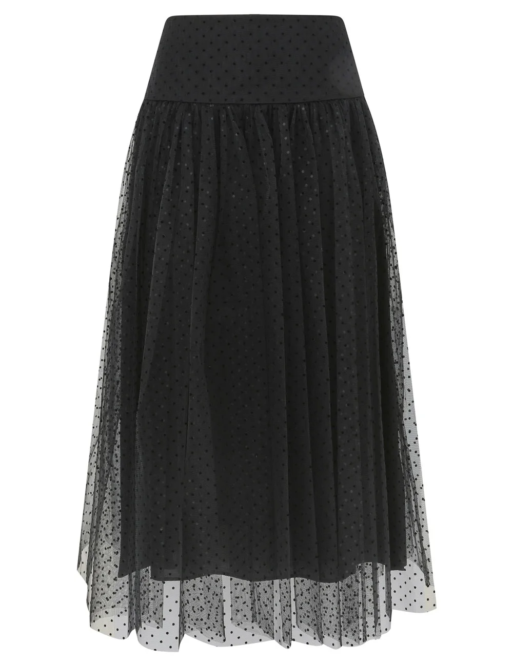 ITEM DETAILS The Tulle Dot Midi Skirt in Black from our Cruise 2026 Collection, Twisted Romance. A midi-length skirt featuring a fixed waistband and an invisible zip closure, finished with patterned tulle overlay. - Layered midi skirt - High-rise waist - Invisible zip closure at centre back - Heavily gathered - Side seam pockets Style Code: 7203SC26R SIZE DETAILS 0P 0 1 2 3 4 Length 31.5 33.5 33.5 33.5 33.5 33.5 Waist 24.5 26 27.5 30 31.5 34 Hip 31.5 33 35.5 37 39.5 41.5 Fitted at the waist, relaxed throughout the legs This garment fits true to size Available in size 0P, suited to clients who are under 5'3"/ 160cm Model is 5'9.5"/178 cm, bust size 32C/10C and wears a size 0 Item measurements are in inches CARE INSTRUCTIONS Main: 100% polyester; lining: 100% viscose Dry clean only code f (hydrocarbon only); Remove any detachable trims prior to dry cleaning; Cover to protect trim; Do not iron; Do not steam; Do not spot clean Always check the label or care card for specific care instructions.