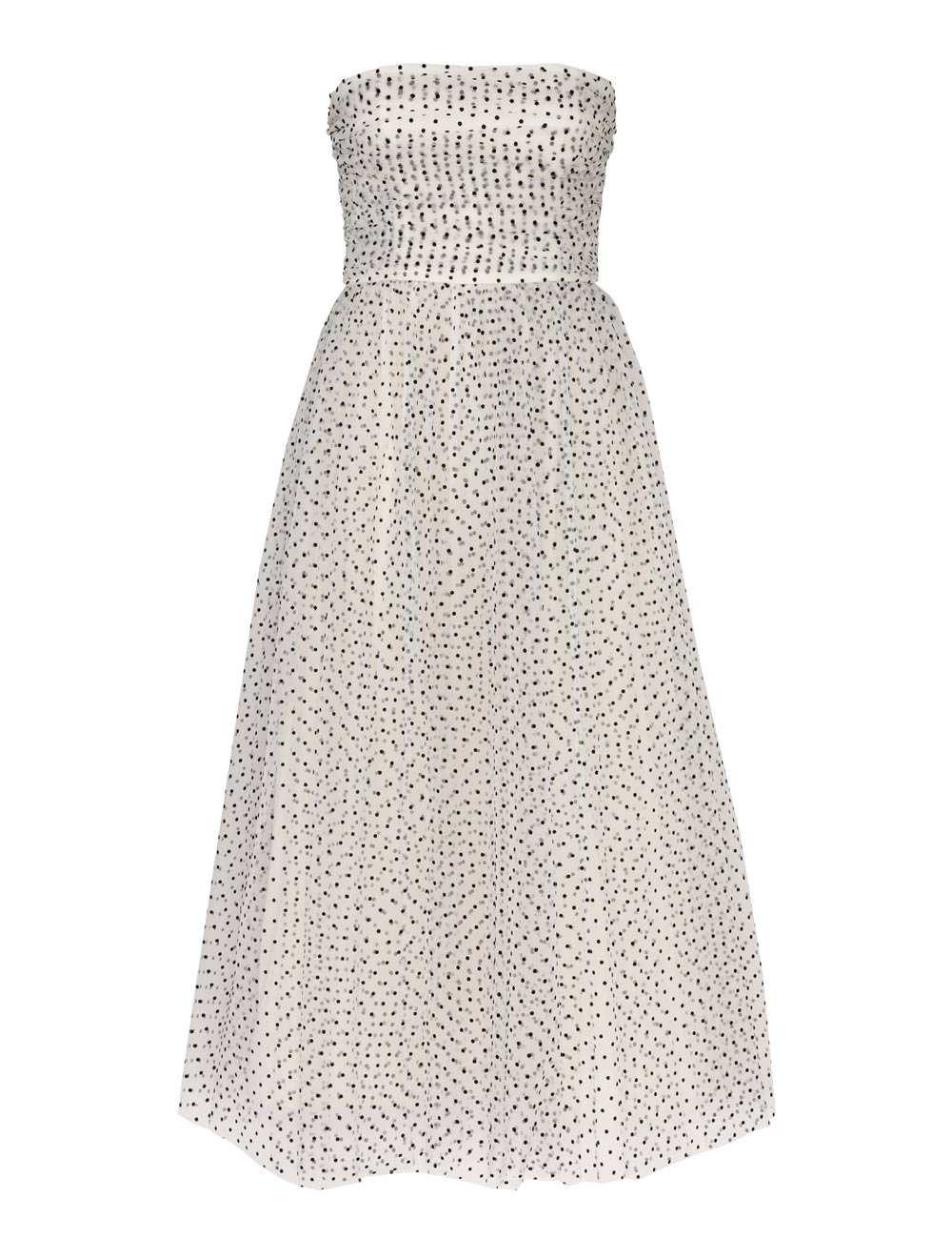 ITEM DETAILS The Tulle Midi Dress in Cream/Black Dot from our Resort 2024 Collection, Matchmaker. A strapless midi dress featuring flocked tulle, bonding at the side seams and side seam pockets. - Strapless midi dress - Side seam pockets behind the lining - Invisible zip - Lined Style Code: 4828DRMAT SIZE DETAILS 0P 0 1 2 3 4 Bust 76 82 86 90 94 100 Waist 64 66 70 76 82 84 Length 93 102 102 102 102 102 Fitted across bodice and waist Relaxed through skirt This garment fits true to size Available in size 0P, suited to clients who are under 5'3"/ 160cm Model is 5'9.5"/178 cm, bust size 32C/10C and wears a size 0 Item measurements have been rounded to the nearest cm. CARE INSTRUCTIONS Main: 100% polyester Lining: 100% viscose Exclusive of trims Dry clean only code f (hydrocarbon) with protective bag Cool iron with protective cloth Light steam only Do not spot clean Turn garment inside out before dry cleaning Always check the garment care label for specific care instructions.