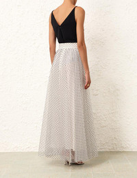 ITEM DETAILS The Tulle Skirt in Cream/Black Dot from our Resort 2024 Collection, Matchmaker. A midi skirt featuring flocked tulle and raw hem. - Midi skirt - Layers of tulle throughout - Invisible zip at centre back - Lined Style Code: 8886SRMAT SIZE DETAILS 0P 0 1 2 3 4 Length 101 110 110 110 110 110 Waist 64 68 72 78 82 88 Fitted high waist Relaxed through hips This garment fits true to size Available in size 0P, suited to clients who are under 5'3"/ 160cm Model is 5'9.5"/178 cm, bust size 32C/10C and wears a size 0 Item measurements have been rounded to the nearest cm. CARE INSTRUCTIONS Main: 100% polyester Lining: 100% viscose Exclusive of trims Dry clean only code f (hydrocarbon) with protective bag Cool iron with protective cloth Light steam only Do not spot clean Turn garment inside out before dry cleaning Always check the garment care label for specific care instructions.