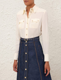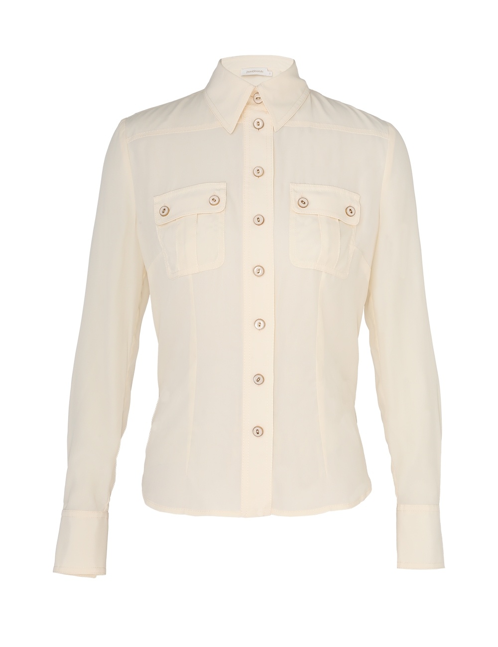ITEM DETAILS The Utility Body Shirt in Cream from our Spring 2024 Collection, Natura. A long sleeve blouse featuring a utility silhouette, chest pockets and a classic collar, finished with buttoned cuff sleeves. - Utility Blouse - Classic collar - Buttons down centre front - Long sleeves - Chest pockets Style Code: 5818TRS24 SIZE DETAILS 0P 0 1 2 3 4 Length 58 62 63 63 64 65 Bust 92 97 102 107 112 117 Waist 77 80 86 91 96 101 Sleeve 50 54 55 55 56 57 Relaxed fit This garment fits true to size Available in size 0P, suited to clients who are under 5'3"/ 160cm Model is 5'9.5"/178 cm, bust size 32C/10C and wears a size 0 Item measurements have been rounded to the nearest cm CARE INSTRUCTIONS 70% viscose 30% silk Exclusive of trims Dry clean only code p with protective bag Cover and protect hardware Cool iron on reverse Do not spot clean Always check the care label for specific care instructions.