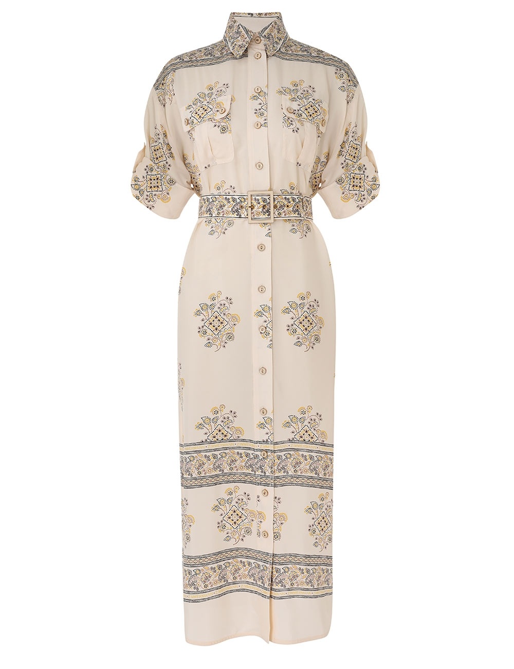 ITEM DETAILS The Utility Dress in Utility Dot Lemon from our Spring 2024 Collection, Natura. A midi dress featuring a utility silhouette with rolled sleeves and a removable self cover buckle belt. - Midi length dress - Buttons down front - Chest pockets - Classic collar - Belt loops with removable belt - Double stitching throughout Style Code: 5820DRS24 SIZE DETAILS 0P 0 1 2 3 4 Length 117 127 128 129 129 130 Bust 115 120 125 130 136 141 Waist 117 122 127 132 137 154 Fitted at the waistline This garment fits true to size Available in size 0P, suited to clients who are under 5'3"/ 160cm Model is 5'9.5"/178 cm, bust size 32C/10C and wears a size 0 Item measurements have been rounded to the nearest cm CARE INSTRUCTIONS 70% viscose, 30% silk Exclusive of trims Remove belt before dry cleaning Dry clean only with protective bag Cool iron on reverse Do not spot clean Always check the care label for specific care instructions.