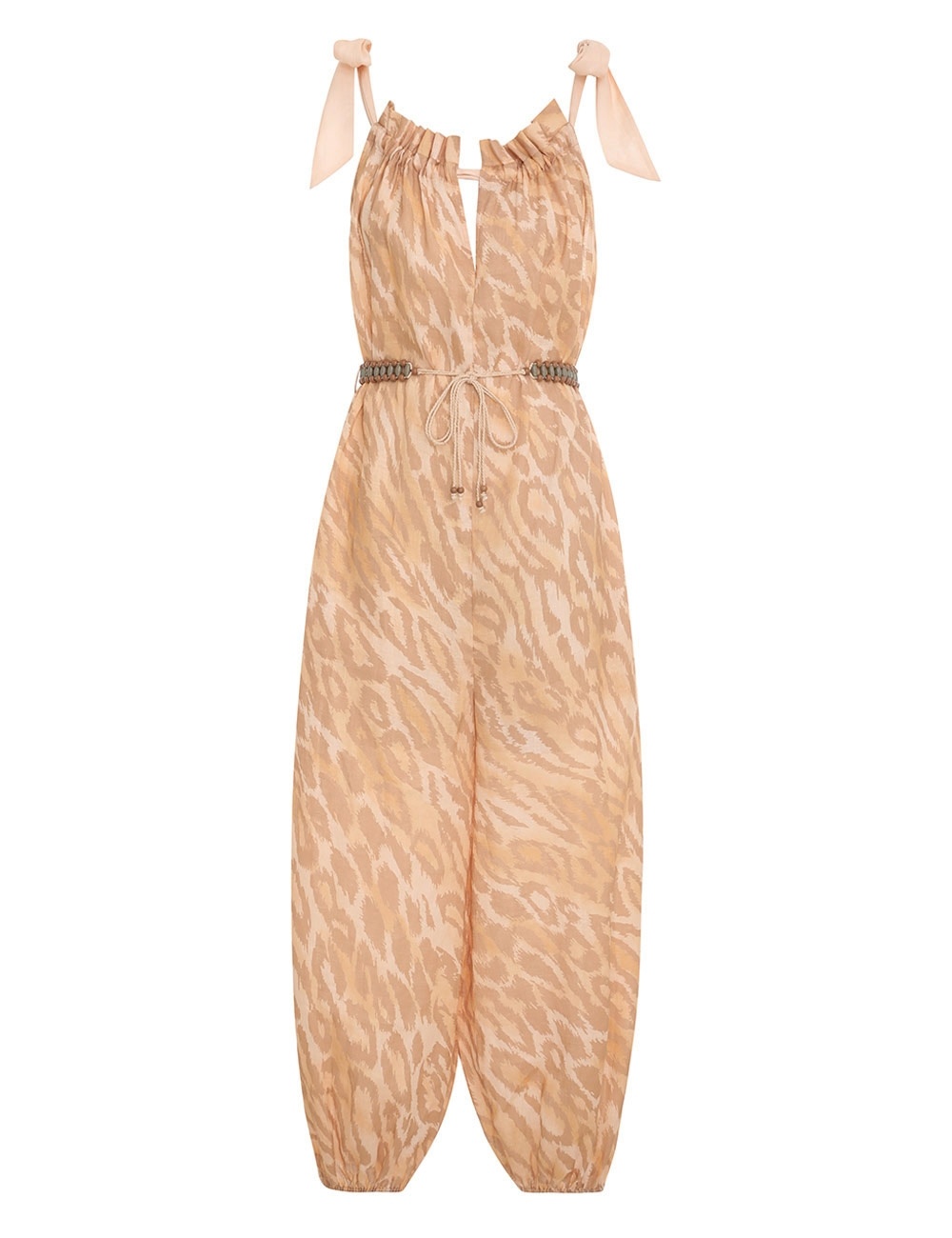 ITEM DETAILS The Violet Tie Jumpsuit in Pale Leopard from our Summer Swim 2022 Collection. A linen jumpsuit featuring a folded frill at the neckline, side seam pockets and shoulder ties in contrast silk habotai. - Linen relaxed jumpsuit - Side seam pockets - Split at centre front - Spaghetti belt loops - Elasticated leg cuffs Style Code: 4312USS225 STYLING Style the jumpsuit with the Rockpool Sandal Sandal and Double Cord Pearl Necklace or pair with the Open Weave Crown Boater and Canvas Espadrille Derby to wear to you next escape in the sun. SIZE DETAILS 0P 0 1 2 3 Bust 127 132 137 142 147 Waist 126 131.2 136 141 146 Outside leg length103 112 113 113 114 This garment fits true to size, we recommend you select your normal size. Relaxed fit. Available in size 0P, specially designed with petite proportions that are suited to clients who are under 5'3"/ 160cm. Our model is 5'9.5" / 178 cm, bust size 32C/10C and is wearing a size 0. CARE INSTRUCTIONS Main: 100% linen Exclusive of trims Remove belt before laundering Dry clean only code p Cool iron Do not spot clean Always check the garment care label for specific care instructions